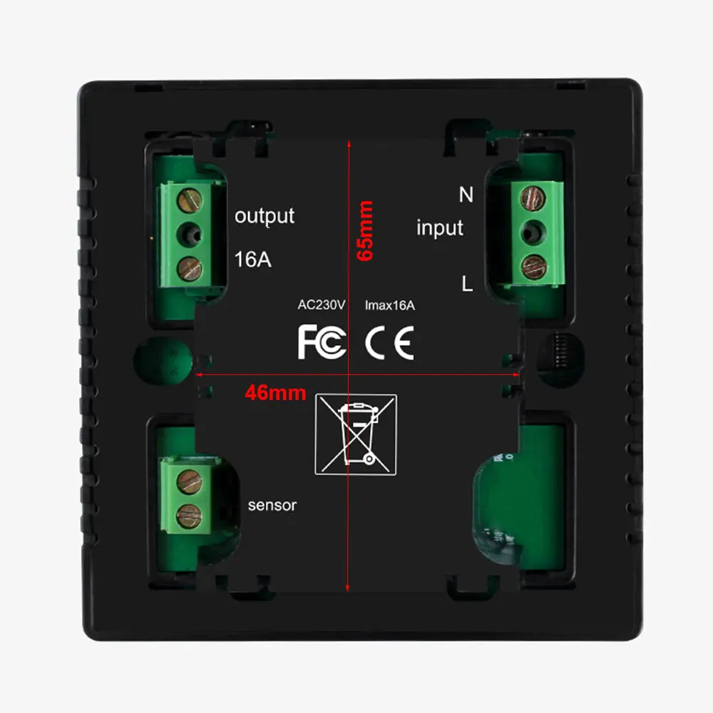 -Напряжение: AV 85-240 В 60 Гц Максимальный ток: 16 A Мощность: менее 1 Вт Тип датчика: NTC Кнопка: сенсорный ключ Точность: ± 1 ℃ Диапазон температур: 5-38 ℃ Размер: 85*85*16 мм
