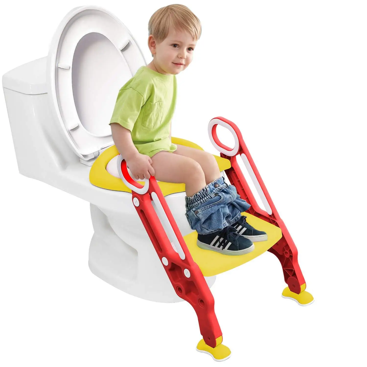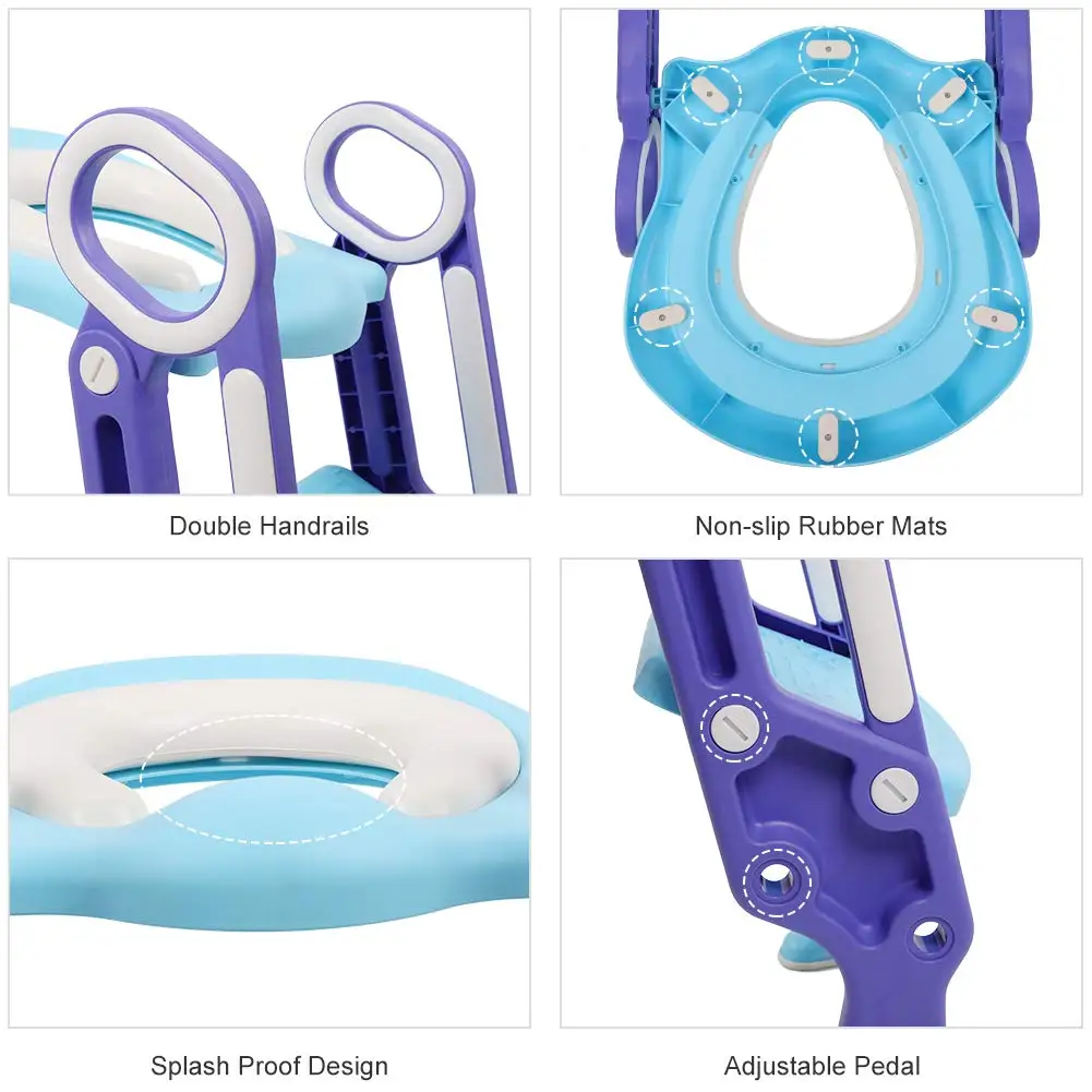 Безопасный и удобный-Двойные поручни и противоскользящие широкие педали делают его более безопасным, когда малыш поднимается вверх и вниз. Мягкая подушка для сидения предлагает вашим детям большой опыт и комфорт. Дизайн С нескользящими ножными подушечками и 6 резиновыми ковриками на кнопке сиденья делает тренировочное сидение более стабильным и плавным