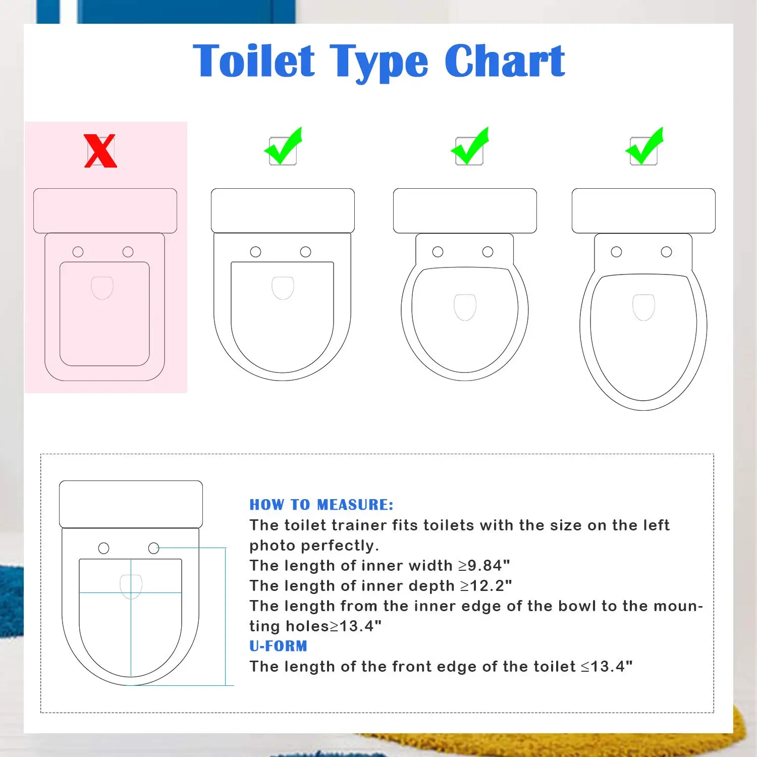 Универсальный дизайн для мальчиков и девочек-унисексПодходит для стандартных туалетов высотой от 14 до 16,1 дюймов (от пола до сиденья). Подходит для большинства туалетов, таких как v-образная форма, u-образная форма, круглая форма, а не квадратная. Сиденье для унитаза potty превращает туалеты для взрослых в безопасные для детей, которые подходят для большинства детей и малышей (рекомендуемый возраст от 2 до 7 лет)