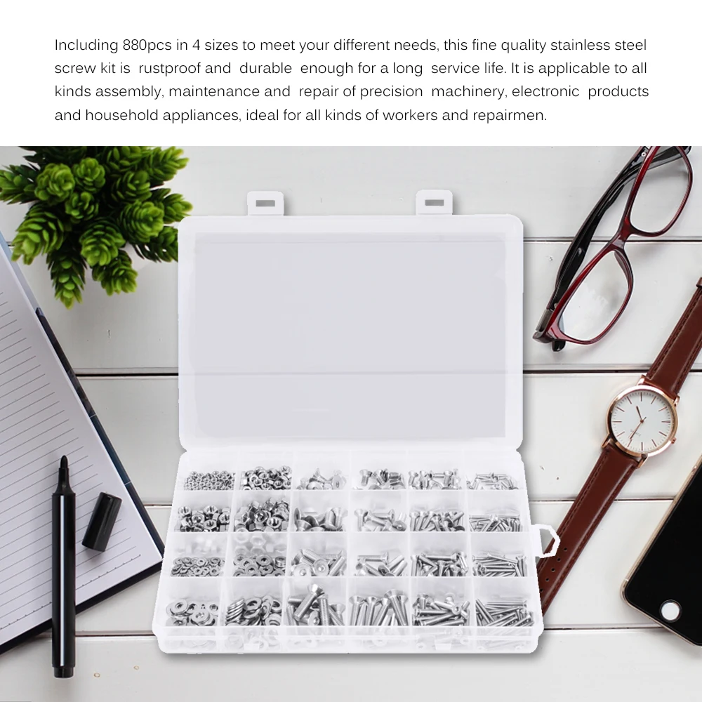 Включая 880 штук в 4 размерах для удовлетворения ваших различных потребностей, этот высококачественный комплект винтов из нержавеющей стали является водонепроницаемым и достаточно прочным для длительного срока службы. Он подходит для всех видов сборки, обслуживания и ремонта точного оборудования, электронных продуктов и бытовой техники, идеально подходит для всех видов работников и ремонтников.