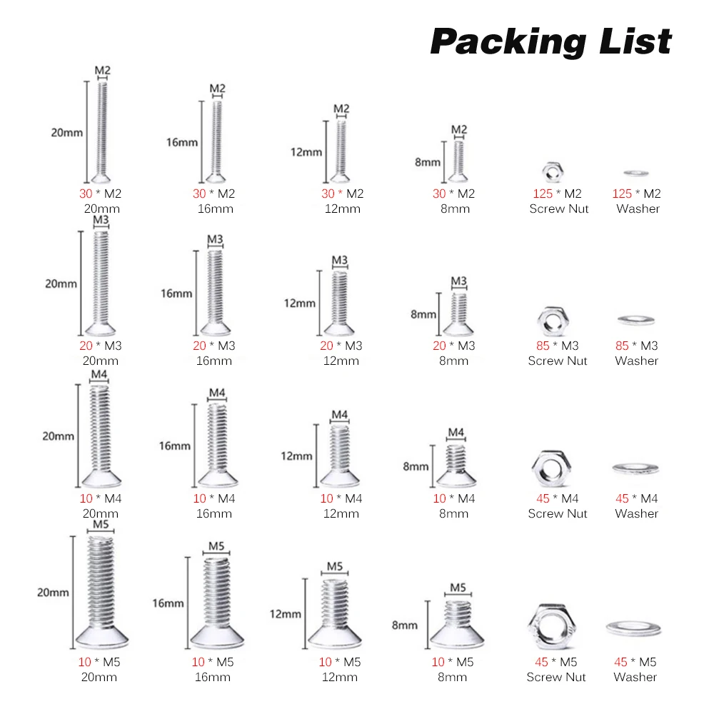 -880 шт. в комплекте: Винтовые гайки, шайбы и потайные шестигранные винты разных размеров.