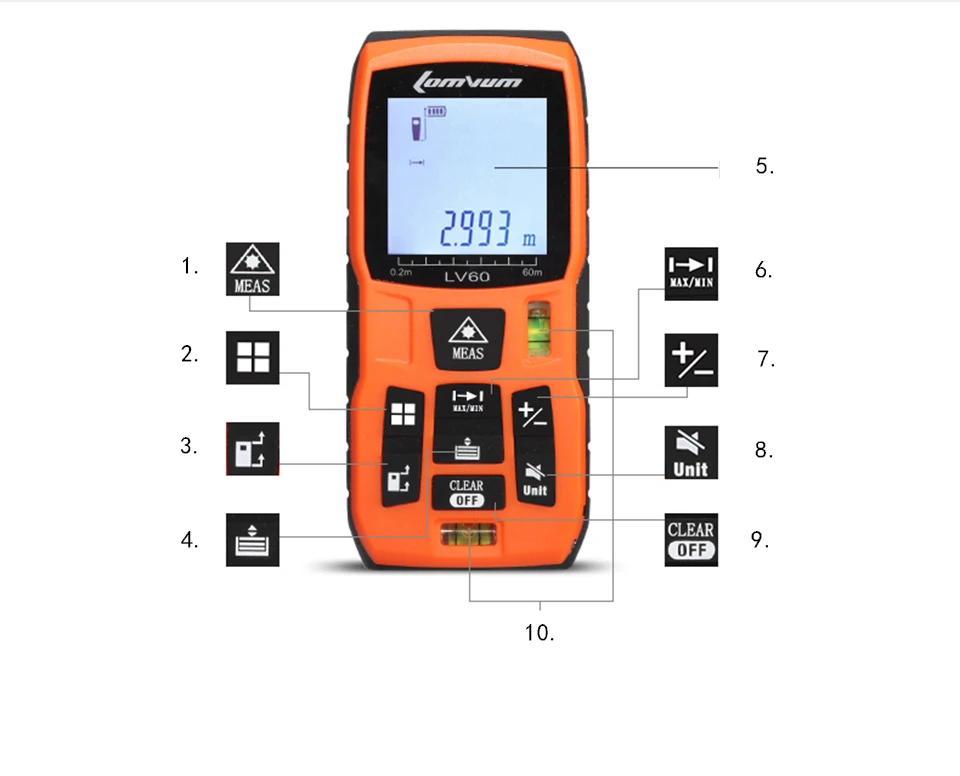 1. Включение/лазерное излучение 2. Измерение площади 3. Передний/задний контрольный переключатель 4. Запись данных 5. HD задний светильник 6. Непрерывное измерение 7. Добавить/Substract 8. Выключение звука/блок 9. Очистить/выключить 10. Уровень пузырей Конструкция с двумя пузырьками повышает точность при измерении расстояния.