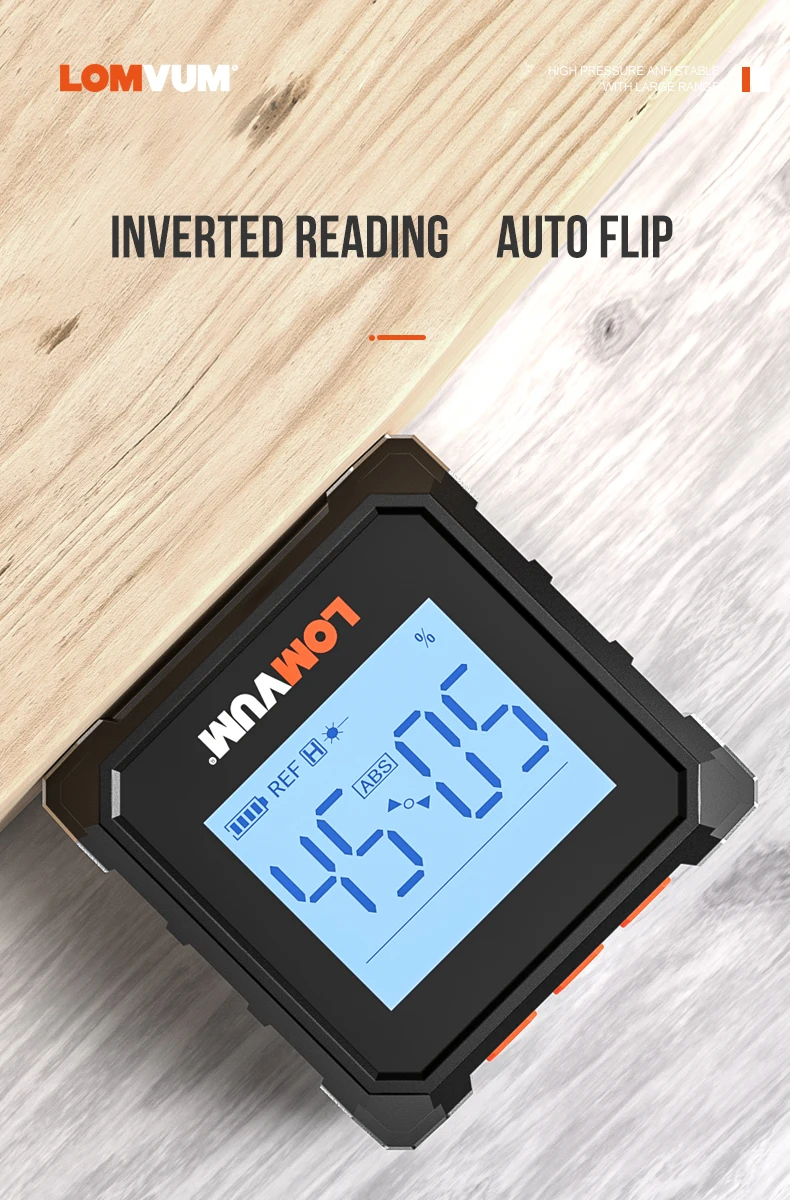 Магнитный дизайн позволяет LOMVUM лазерный цифровой транспортир быть прикреплен к любой металлической поверхности. Измерение угла 360 ° или Измерение наклона в 4 направлениях. LOMVUM цифровой Угловой Инструмент может измерять в абсолютных и относительных измерениях для определения точного угла или разницы между 2 углами.