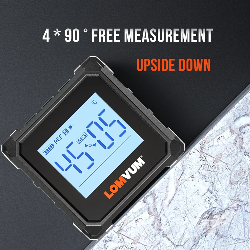 LOMVUM Laser Digital Protractor имеет Карманный и легкий размер. Когда Инклинометр перевернут вверх дном, угол считывания на ЖК-дисплее автоматически откидывается и легко читается.