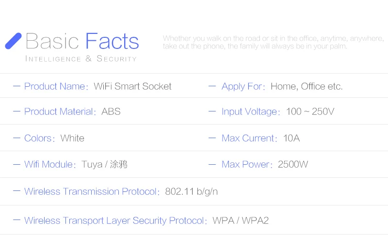 * Номер модели : CS-WFSPRO * Входное напряжение: 100-250 В переменного тока ~ 50-60 Гц * Максимальный ток: 10 А * Максимальная мощность: 2500 Вт * Материал корпуса: АБС-пластик + Поликарбонат (высокотемпературные огнестойкие материалы 750 ℃) * Сертификация: CE/FCC/ROSH * Тип вилки: ЕС, США, Великобритания, ил, Австралия, бр * Рабочая влажность: <80% * Рабочая температура: от-20 °C до 70 °C * Беспроводная связь: Wi-Fi IEEE 802,11 b/g/n 2,4 ГГц * Частота Wi-Fi: 2,4 ГГц (не работает с Wi-Fi 5 ГГц) * Уровень безопасности сети: WPA/WPA2" * Цвет: белый