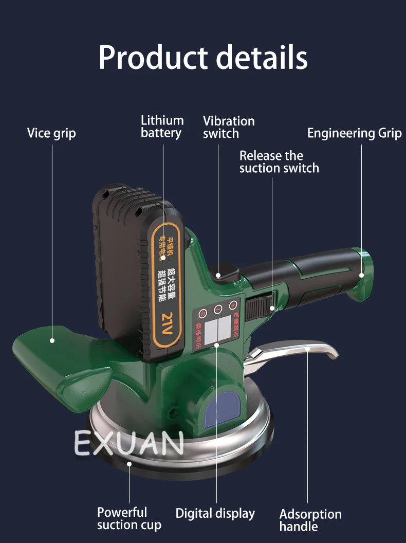 Функция продукта: настенная плитка, керамическая плитка Область применения: 30-120 см плитка Напряжение батареи: 21 в Характеристики двигателя: 8 дюймов Вибрационная передача: 9 регулировок зубчатой передачи Диаметр присоски: 150 мм Материал присоски: алюминиевый сплав Вес всасывания: 320 кг Вес машины: 1,65 кг Частота вибрации: 24000R Советы: 1. Литиевая батарея на машине предназначена только для отображения. Посылка включает литиевую батарею.