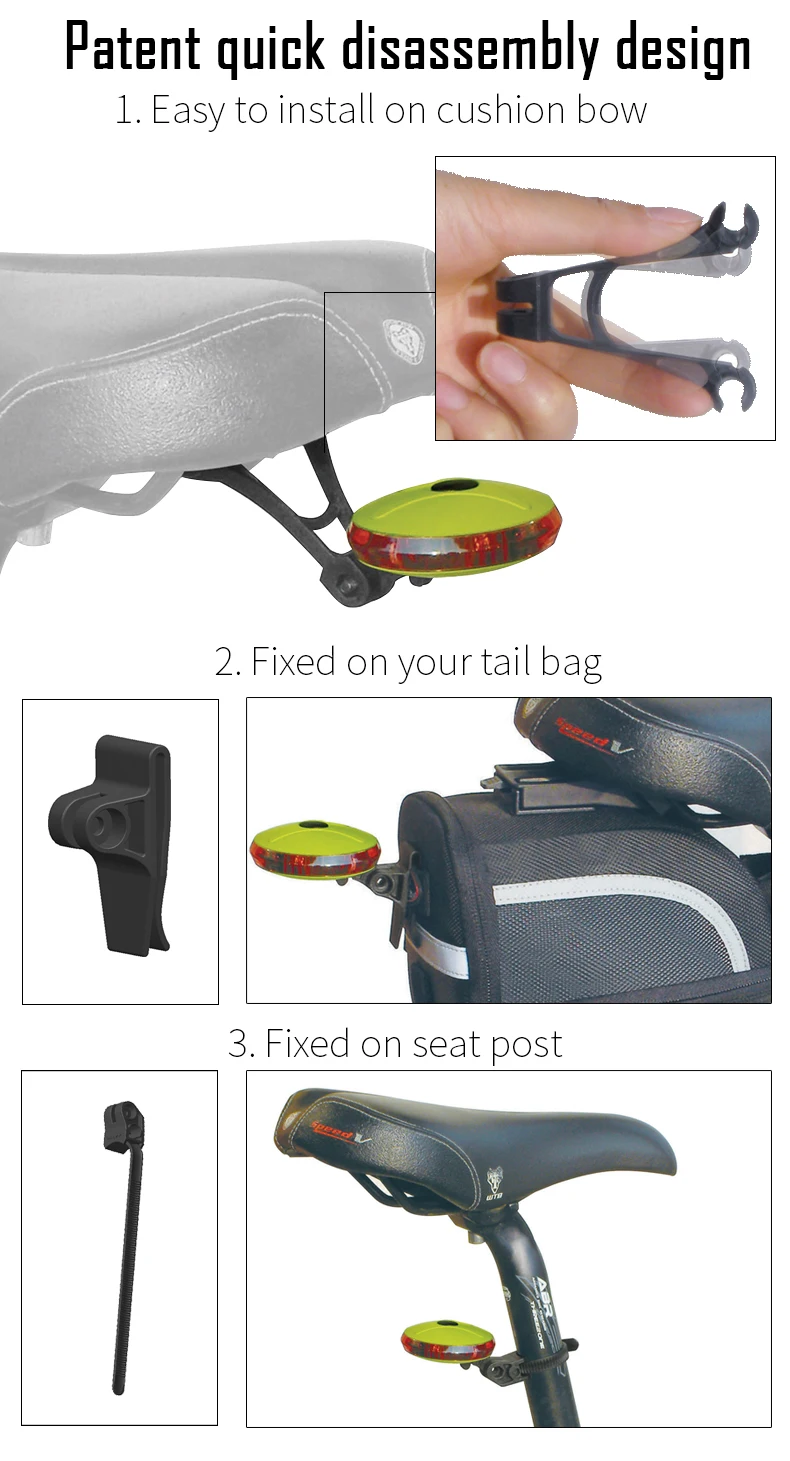 Название бренда: EasyDo Название продукта: задний светильник для велосипеда UFO Номер модели: EL-2205 Вес: 25 г (батарея и аксессуары в комплект не входят) Цвет: черный, серебристый, зеленый, белый Размер: 60*63*22 мм Светильник: 6 шт. светодиодный Батарея: 2 шт. аккумулятора AAA Яркий режим: устойчивый яркий, мигающий, красочный EasuDo патентный дизайн, три внутренних способа.