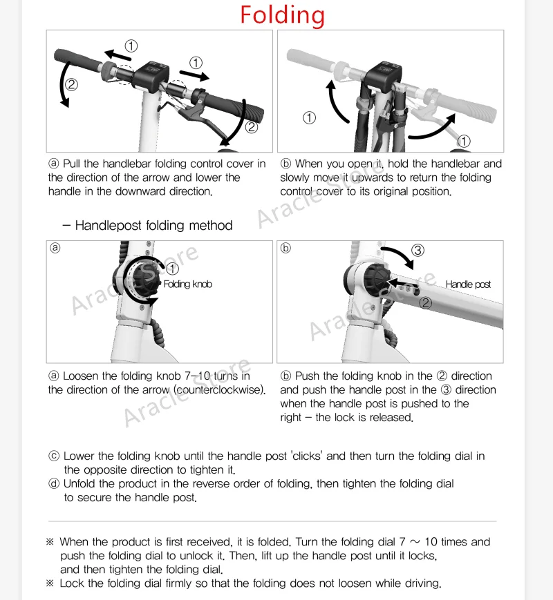 -Метод складывания руля A) Вытяните складную крышку управления руля в направлении стрелки и опустите ручку в направлении вниз. B) когда вы открываете его, удерживайте руль и медленно перемещайте его вверх, чтобы вернуть складную крышку управления в исходное положение. -Метод складывания руля A) ослабьте складную ручку 7-10 поворотов в направлении стрелки (против часовой стрелки). B) нажмите на складную ручку в ② направлении и нажмите на ручку в ③ направлении, когда рукоятка нажимается вправо-замок отпущен. C) Опустите складную ручку до тех пор, пока ручка не «кликнет», а затем поверните складной циферблат в противоположном направлении, чтобы затянуть его. D) разверните изделие в обратном порядке, а затем затяните складной циферблат, чтобы закрепить ручку. * Когда продукт впервые получен, он сложен. Поверните складной циферблат 7-10 раз и нажмите на складной циферблат, чтобы разблокировать его. Затем Поднимите ручку до фиксации, а затем затяните складной циферблат. * Надежно зафиксируйте складной циферблат, чтобы он не распухался во время вождения.