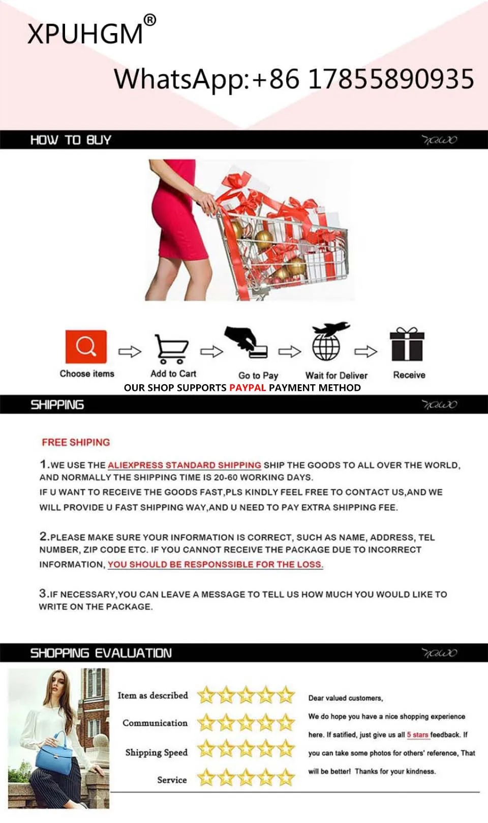 Это специальная ссылка для наших vip-клиентов. В большинство стран Срок доставки: 10-15 дней Дропшиппинг и оптовая торговля поддерживаются, мы заботимся о вашем времени, поэтому мы стараемся сделать все возможное, чтобы сделать ваш шоппинг приятным, бесшовным и беспроблемным. Мы надеемся, что вам понравится так же, как и нам, и у вас будет большой опыт покупок здесь. Для оптовой продажи, пожалуйста, свяжитесь с нами, чтобы получить лучшую цену. Наша команда склада и логистика будут работать 24/7, чтобы получить ваши товары к вам, пожалуйста, будьте уверены, что мы делаем все возможное, чтобы отправить ваши посылки к вашему клиенту как можно скорее. Клиент: сколько заказов вы можете обрабатывать в день? A: мы можем обрабатывать 1000 заказов в день. Клиент: Как насчет качества вашей продукции? О: наша команда имеет профессиональных инспекторов, которые проверят каждый продукт перед отправкой его клиенту. Клиент: Что я должен сделать, если у меня есть проблема и я хочу спросить вас? У вас есть WhatsApp? О: Да, мой WhatsApp: + 86 17855890935. Клиент: Поддерживаете ли вы оплату PAYPAL? О: Да, мы уже открыли способ оплаты PAYPAL. Клиент: у вас нет на складе некоторых продуктов? О: у нас есть собственная фабрика, поставка очень хорошая, пожалуйста, не волнуйтесь! Клиент: что вы можете сделать, когда товары будут повреждены или даже не прибудут покупателю? О: мы повторно доставим или вернем Вам деньги в соответствии с реальной ситуацией! Клиент: как быстро вы можете обрабатывать заказы? Ответ: все дропшиппинг заказы будут обработаны в течение 48 часов! Вы можете использовать наши фотографии бесплатно, у нас есть профессиональная посылка, мы можем быстро оформить заказ.