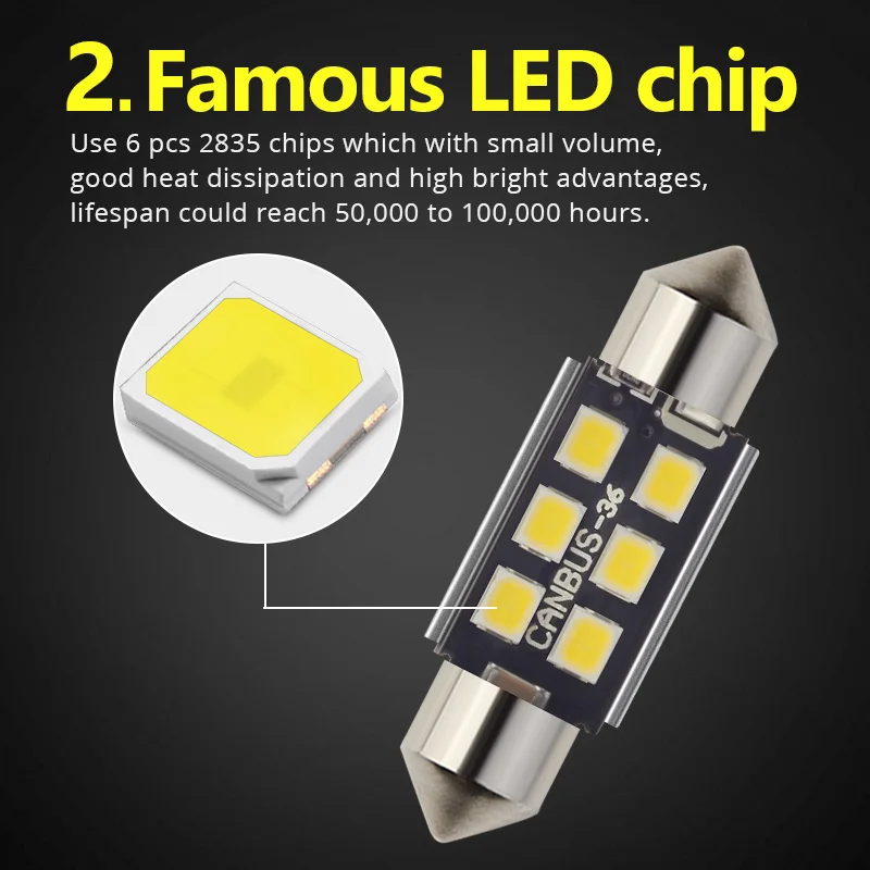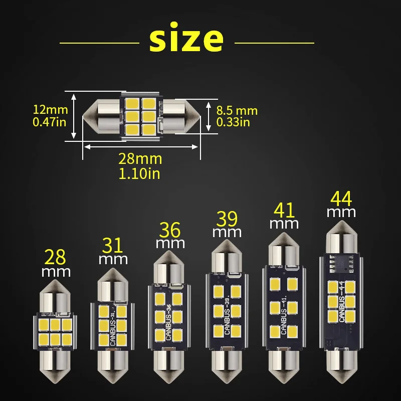 Модель: C5W, C10W Тип светодиодный: 6 чипов 2835 Цветовая температура: 6000K Рабочее Входное напряжение: 12 В постоянного тока Мощность: 1,3 Вт-3 Вт Световой поток: 250LM-450LM Гарантия: 1 год Применение: Автомобильный интерьерный светильник, карта светильник s, купольный светильник, светильник для чтения, светильник для багажника, внутренний светильник, номерной знак светильник s, дверной светильник и т. Д.