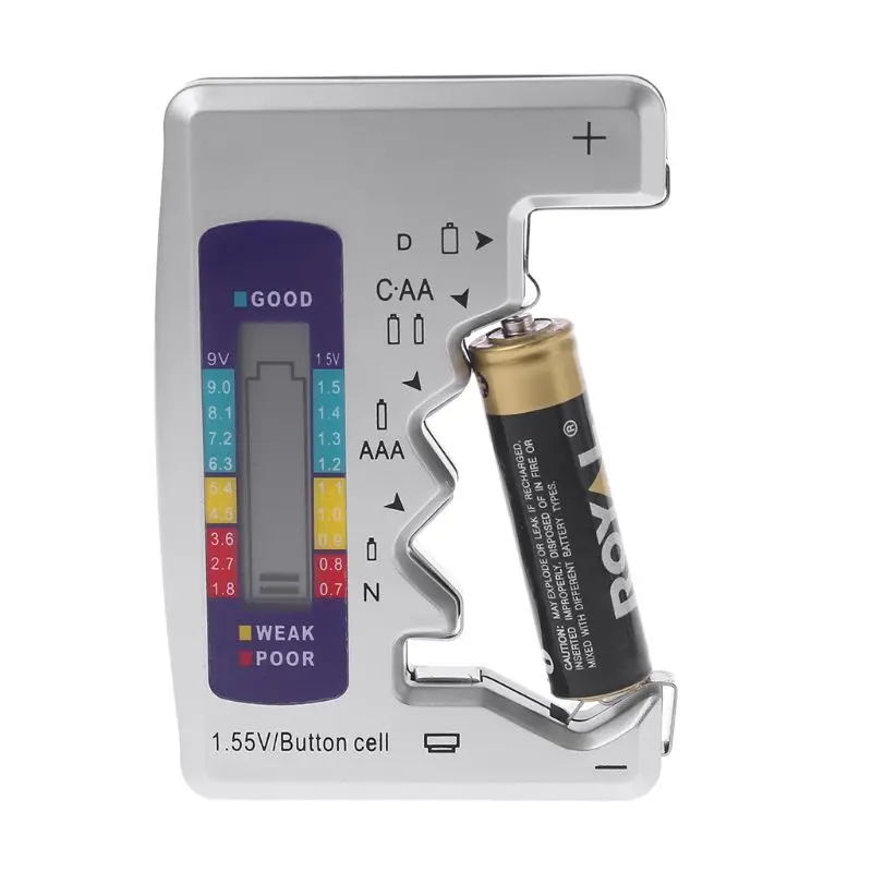 Диапазон тестирования: C, AA, AAA, D, N, 9 В (6F22) батареи и 1,55 в кнопочный элемент
