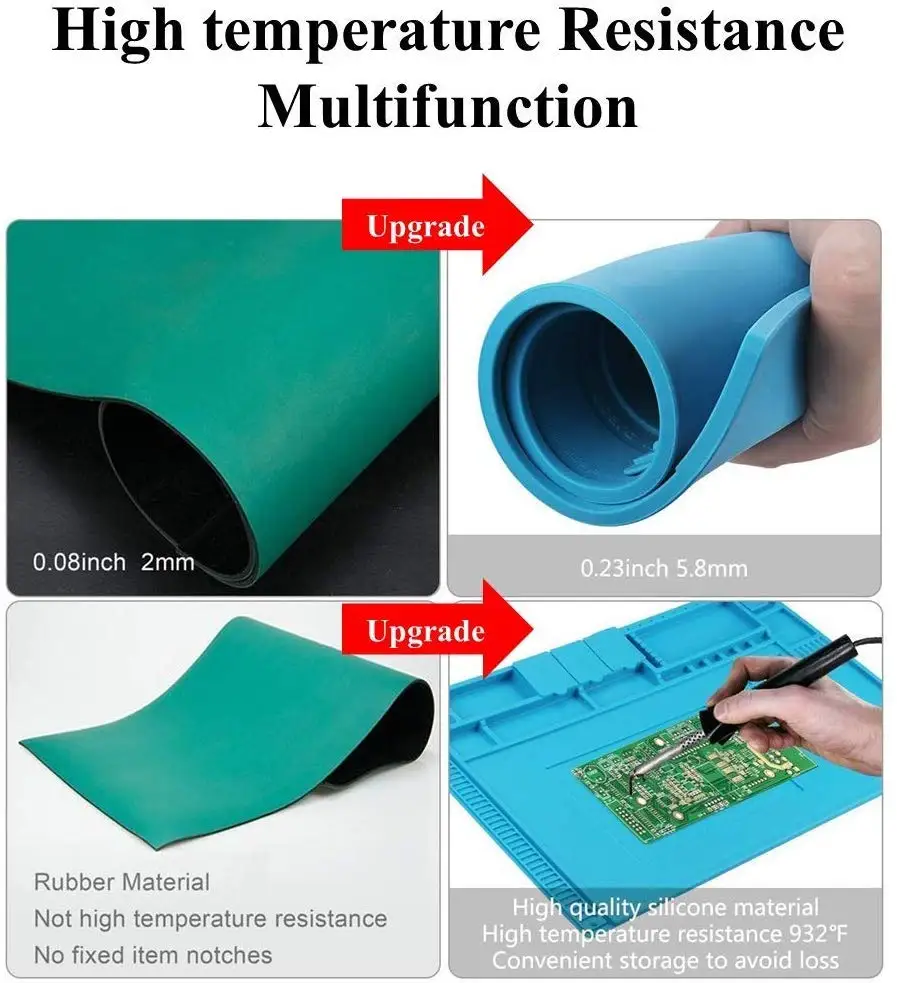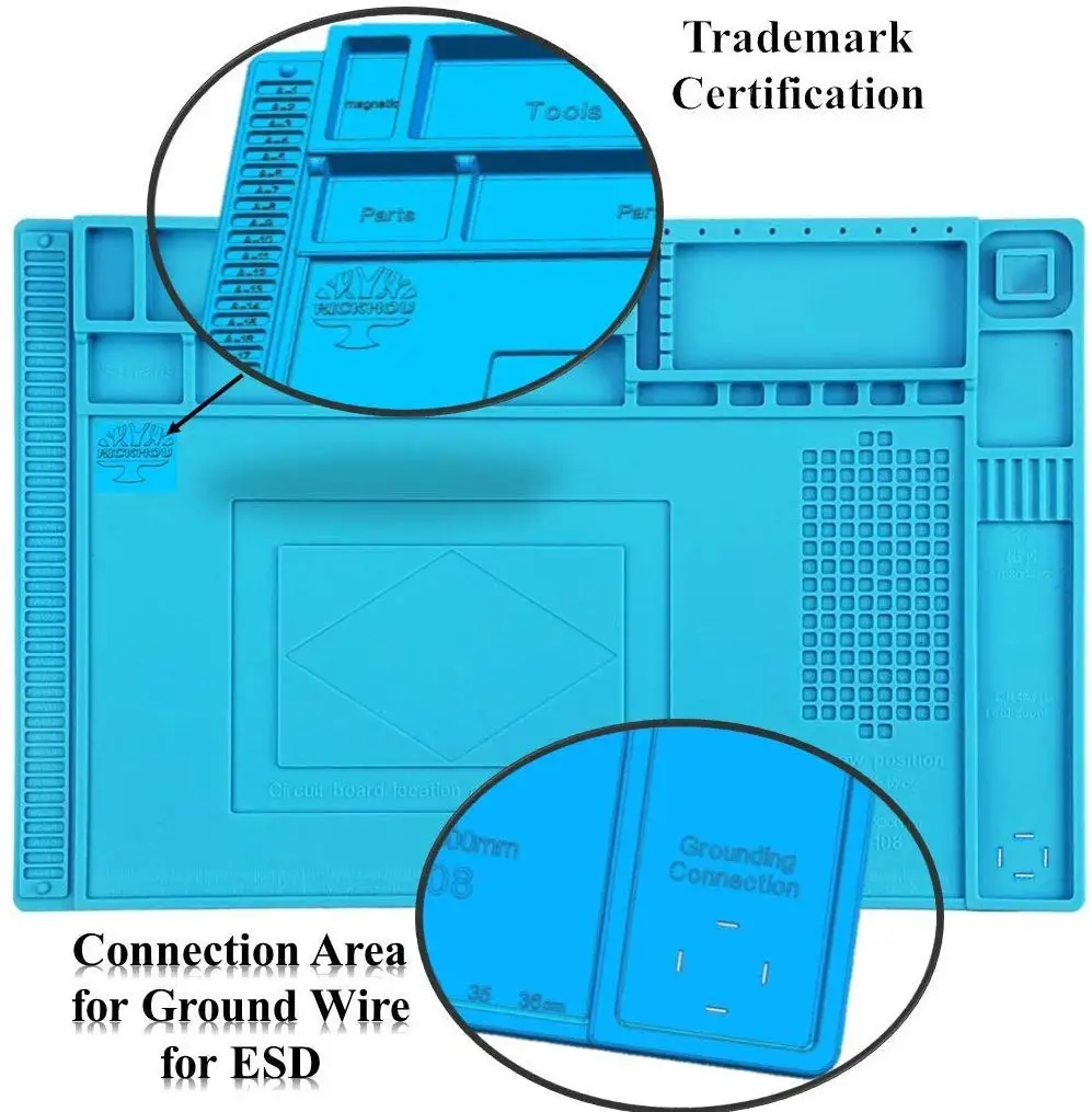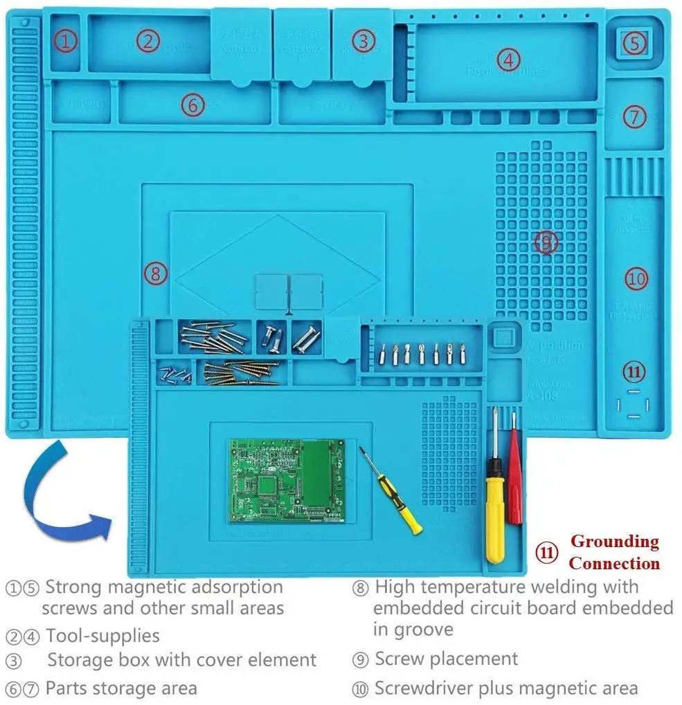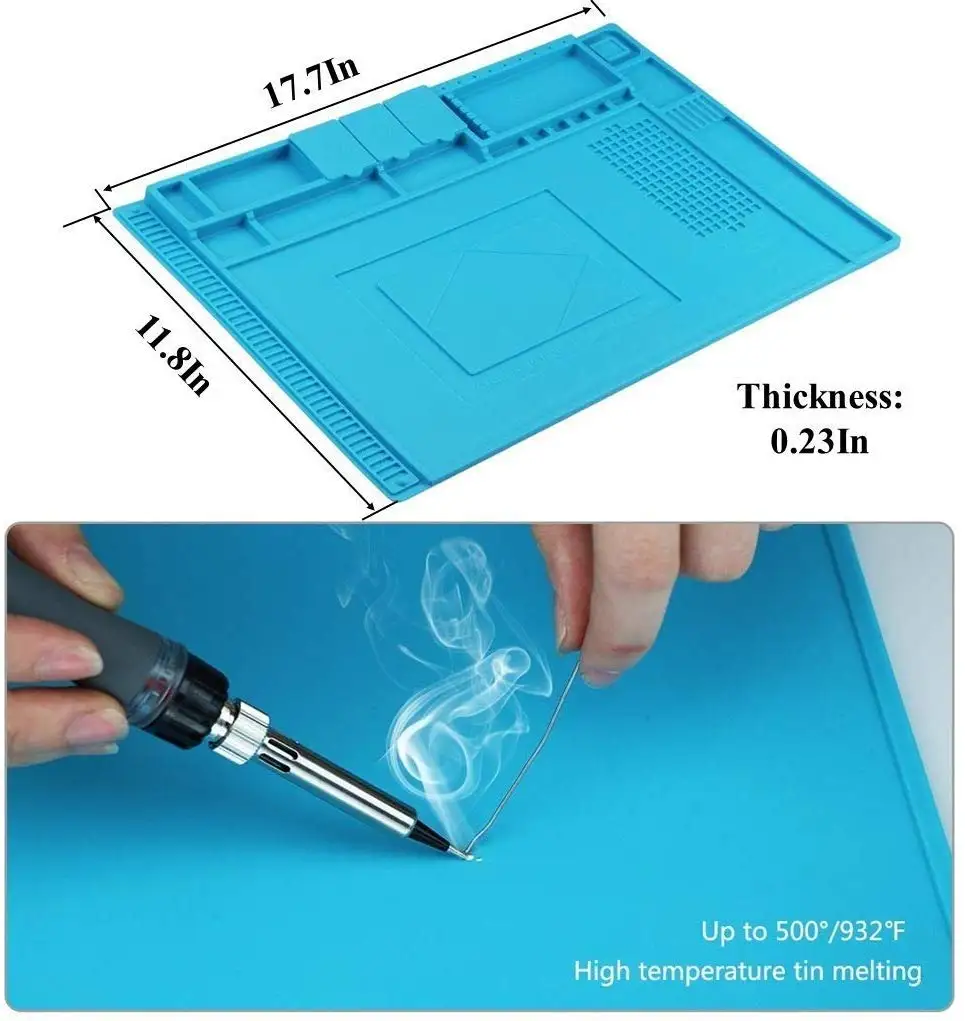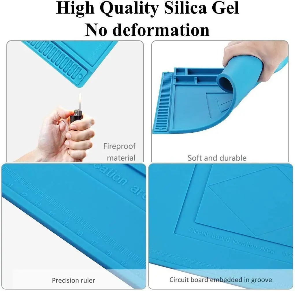 【Многофункциональный силиконовый коврик 】 большой ремонтный коврик-идеальный продукт для пайки электроники в сборе или ремонта электроники и печатной платы, ремонта смартфона, ноутбука, компьютера, спортивных часов, камеры, умных игрушек, очков и т. д. Чтобы сделать ремонт легким, линейка встроенного коврика (0 ~ 36 см), Достаточное положение винтов и несколько магнитных насечек для классификации микросхем, небольших деталей и винтов, что улучшит вашу эффективность работы и сохранит платформу обслуживания чистой и аккуратной.