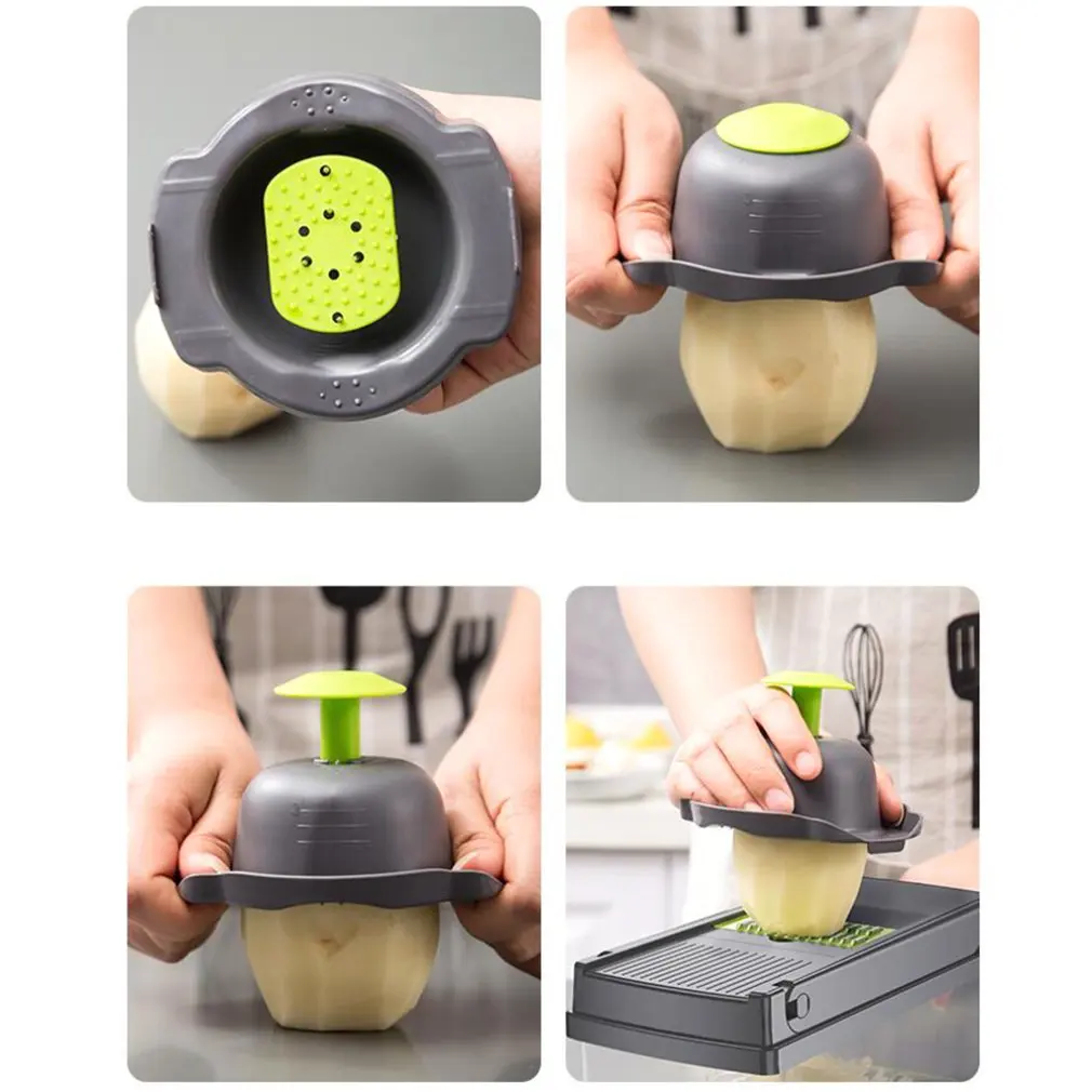 3. Кухонный помощник: Этот ручной слайсер изготовлен из пищевой нержавеющей стали и АБС-пластика без BPA. Он предлагает все функции нескольких устройств со сменными нержавеющими лезвиями. Эти лезвия можно разрезать через все виды овощей, ажурного сыра, нарезать картофель и нарезать фрукты, вы даже можете создать овощи или пюре.