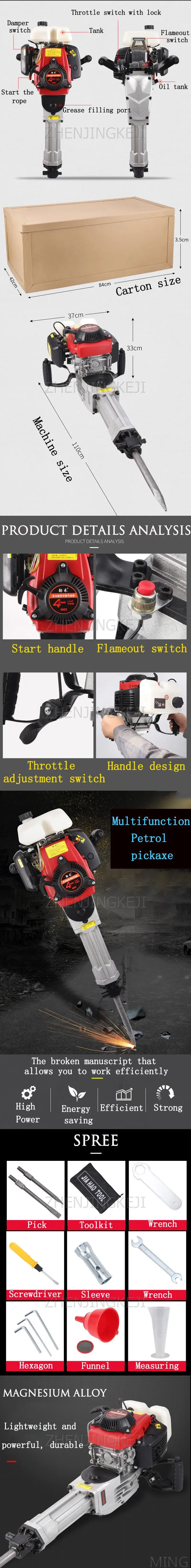 Модель: qyg 30J Наименование: трехразовая машина для разлива бензина Вес: 10,5 кг Размер: 65*32*26 см 11 кг Тип двигателя: одноцилиндровый/air/охлаждения/2-х тактный Энергия внешнего воздействия: 30J Топливо: Бензин: двухтактное моторное масло = 25:1 Максимальный крутящий момент и скорость: 1.5н. М/500р/мин Объем топливного бака: 0,9Л Скорость расхода топлива: ≤ 0,5л/ч Мощность: 1800w Рабочий объём цилиндра: 32.7cc Диапазон бурения: бетон, камень, кирпичная стена Скорость без нагрузки: 400 об/мин Максимальный диаметр сверла: 40 мм Время молотка: 3200 раз/мин