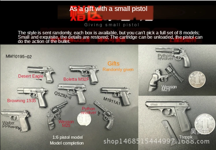 Номер детали: MM10195-02 Название: знаменитый пистолет + пистолет 6 моделей Винтовка: SVT 40,Kar 98K,M-200,RPG,38,G43 Пистолет: Sand eagl,M92F,Browning 1935,QSZ92-II,M1911A1,M29, Anaconda revolver (случайный) Упаковка: Без оригинальной коробки Соотношение модели 1:6, длина пистолета составляет около 185, разные стили и размеры немного отличаются Пластиковый материал Быстрая сборка, клей не требуется для сборки Некоторые стили болта могут имитировать вытягивание 1 1:6 в сборе пистолет для каждой модели, 6 для каждого набора Статическая модель, не съемка, только для отображения и сбора Не устойчив к борцовке, подходит для людей старше 14 лет