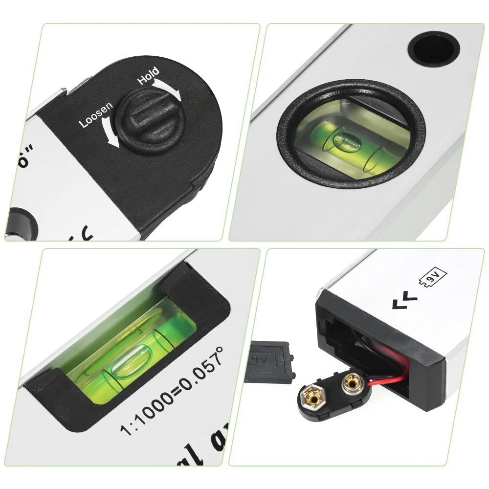 2 различных пузырька для выравнивания-прозрачные и инстинктивные зеленые акриловые пузырьки с топовым изображением, позволяющие легко считывать пузырьки, уровень и 45 градусов, обеспечивают максимальную читаемость, а рама из алюминиевого сплава обеспечивает долговечность и долговечность.