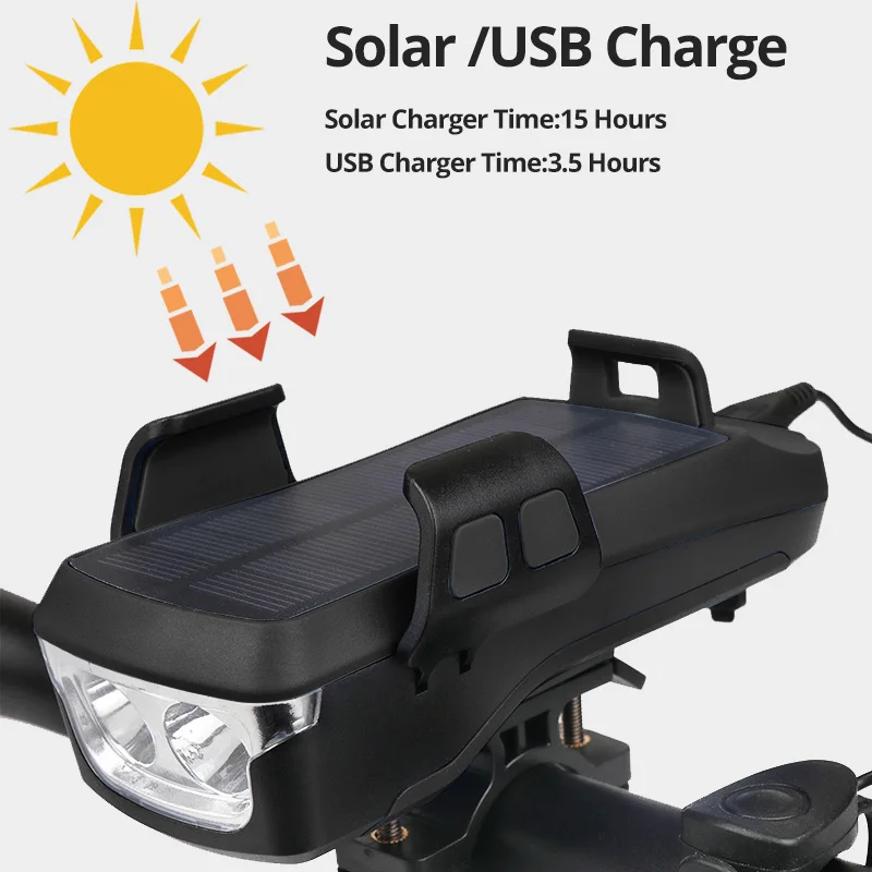 Солнечный велосипедный фонарь: макс. 800 люмен, расстояние светильник 200-300 метров. 4 часа для режима высосветильник ности, 6 часов для режима слабой светильник ности. Водонепроницаемость IPX65, не беспокойтесь о дожде. Источник питания: можно заряжать с помощью USB и солнечной энергии. С солнечной панелью он может автоматически заряжать на солнце. Встроенная Высококачественная перезаряжаемая литиевая батарея емкостью 4000 мАч, Экологичная, безопасная и эффективная. Велосипедный звонок: проводное управление. Есть 5 видов режимов звука. 130 дБ. Нажмите и удерживайте в течение 5 секунд, чтобы выбрать желаемый звуковой режим. Подходит для всех типов пользователей.