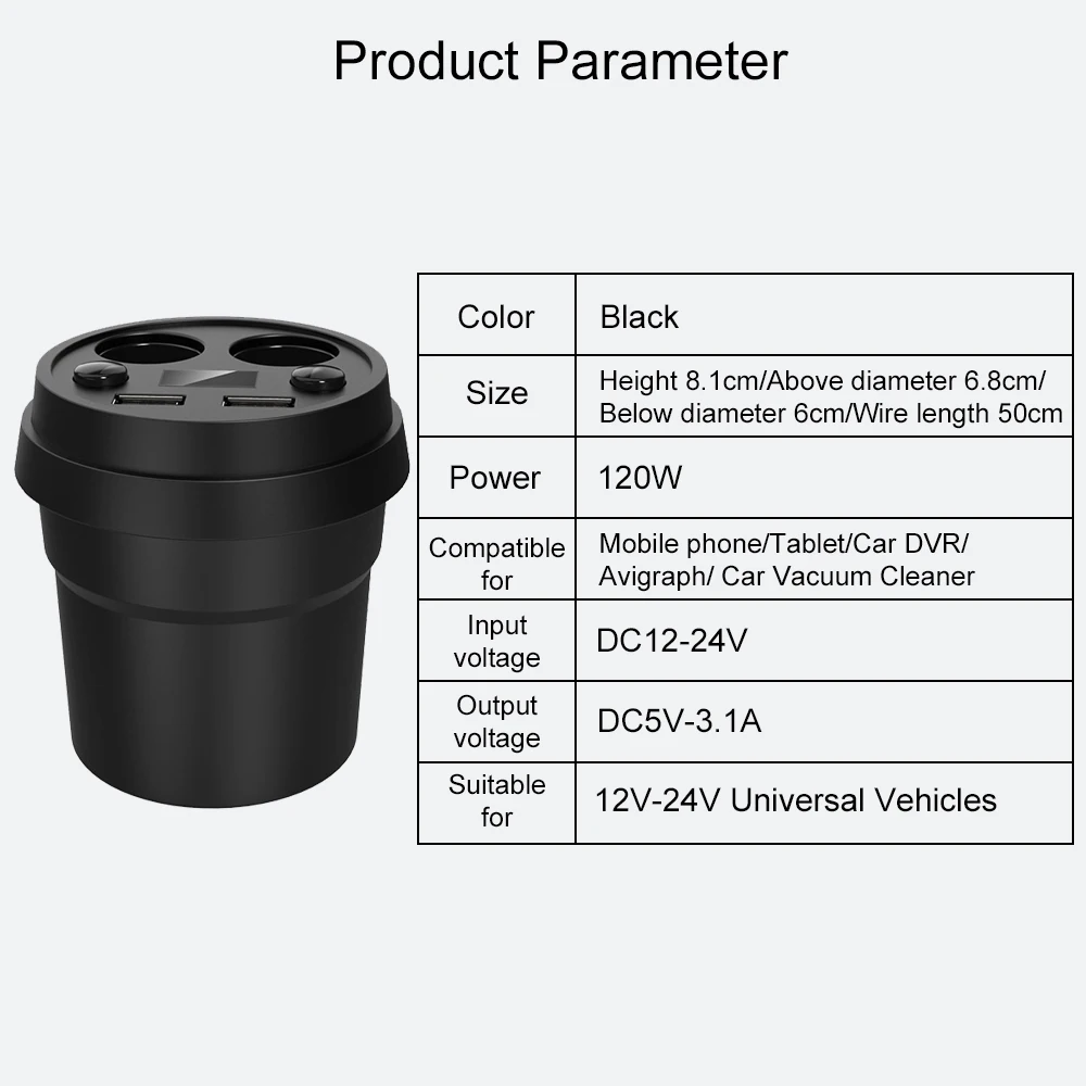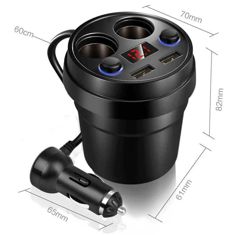Материал: АБС-пластик Вход: 12 В ~ 24 В постоянного тока Выход: 5 В/3,1 а постоянного тока (все смарт-зарядки) Длина шнура питания: 50 см Размеры: 3,3x3,67x4,36 дюйма/8,5x9,3x11,2 см Вес: 7,96 унций/226,5 г Совместимость: подходит для всех 5 мобильных устройств, таких как планшетные компьютеры, электронные устройства и смартфоны (кабели для зарядки в комплект не входят) 2 порта USB 2 разъема для прикуривателя 2 x переключатели Светодиодный дисплей-1 шт.