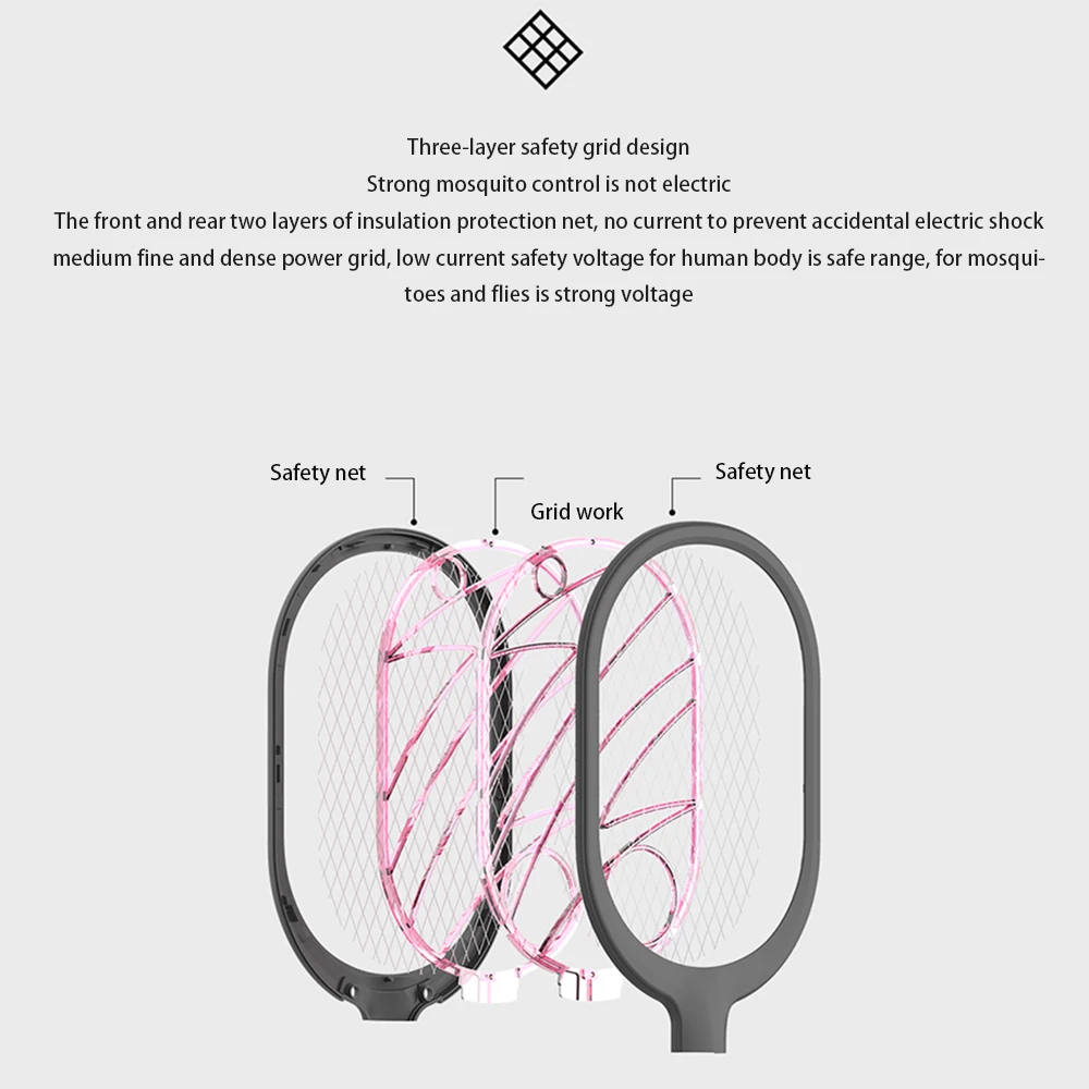There are two layers of insulation protection nets on the front and back, no current to prevent electric shock. The middle-level fine grid has a low-current safe voltage, which is within the safe range for humans and a strong voltage for mosquitoes and flies.