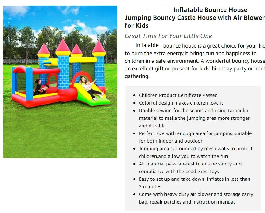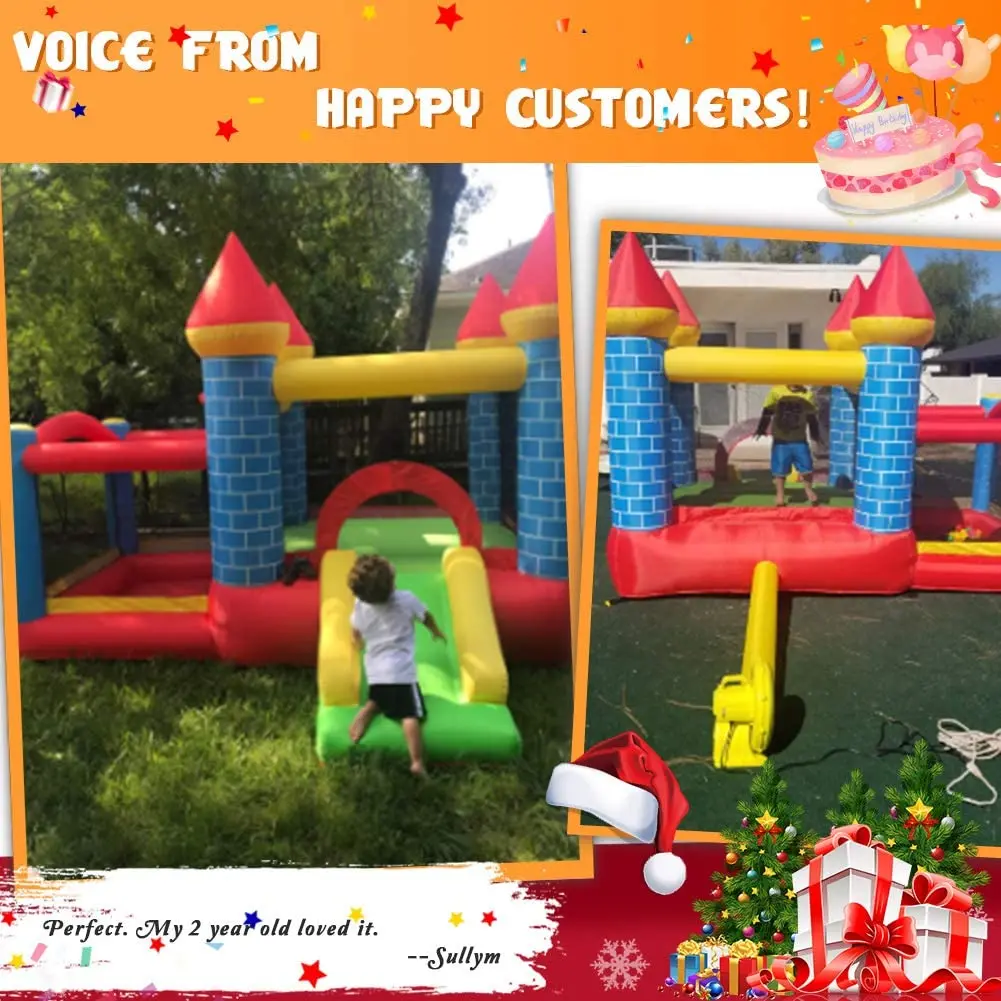 1. Идеальный подарок-надувной замок для надувного дома-это хорошее место для детей, которые будут иметь больше счастья в течение часа на день рождения, в дни игры друзей и на ежедневные развлечения 2. Прочное и прочное качество-двойной шов для швов из прочного материала нейлоновая ткань Оксфорд 3. Быстрая инфляция идет с инструкцией, надувает надувной дом менее 2 минут, держать вентилятор работает во время игры детей 4. Легко хранить и переносить-быстро сдувать надувные менее 2 минут, можно носить в любом месте удобно с поставляемой сумкой или хранить ее, когда не используется 5. В комплект входит сверхмощный и водонепроницаемый воздуходувка