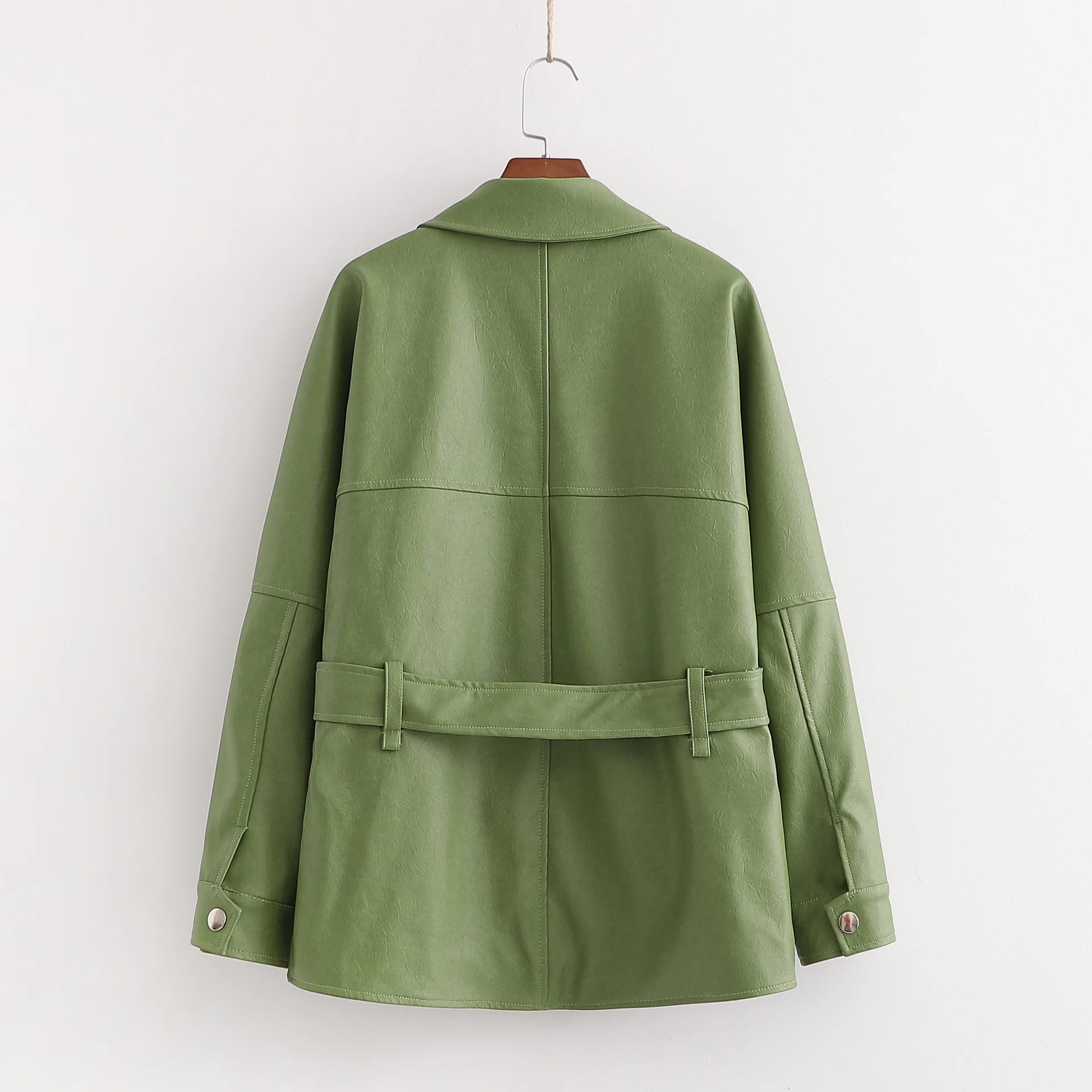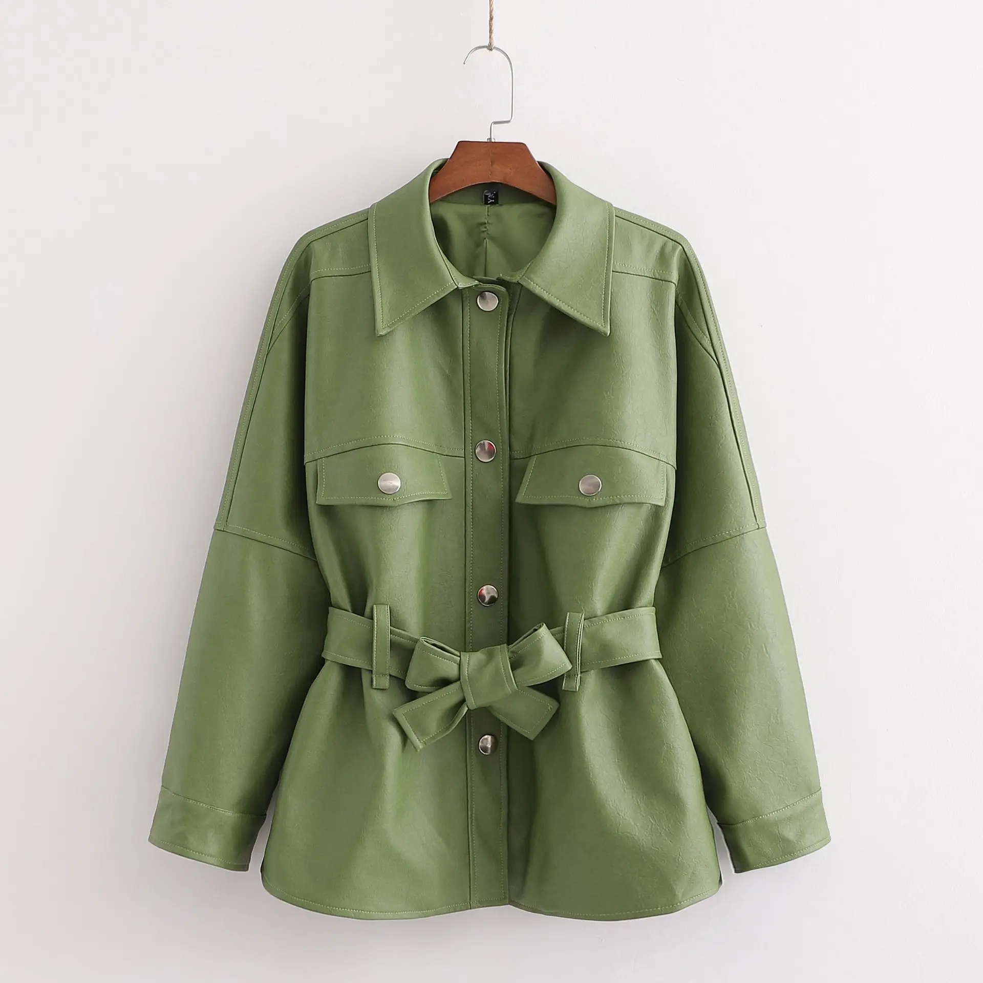 Женская винтажная куртка из искусственной кожи, зеленая Свободная куртка с поясом, верхняя одежда, весна-осень 2020
