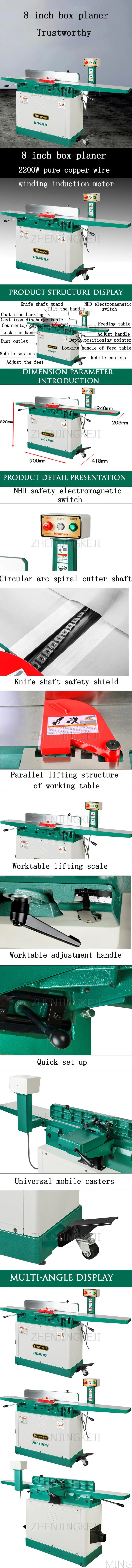 H0490/H0490X те же параметры: Напряжение: 220 В/50 Гц Емкость шипа: 15,875*203 мм Мощность двигателя: 2200 Вт Стол: 820 мм Скорость режущего вала: 5000 об/мин Ручка: 2 Максимальное строгание: 3,175 мм Размер машины: 1940*650*1170 мм Размер упаковки: 2060*610*320 мм Длина шкафа: 72/84 кг Разница: H0490: прямой нож/4 лезвия Спецификация: 205*20*3 мм H0490X: Спиральный нож с круглой дугой/40 Технические характеристики: 15*15*2,5 мм