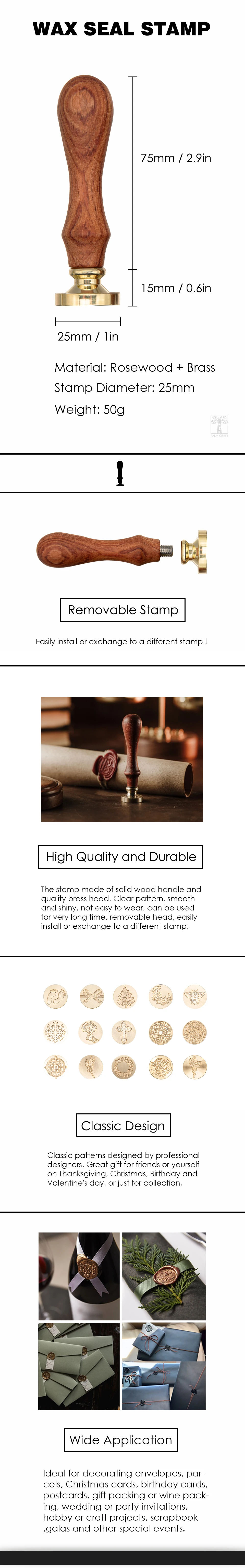 • Высокое качество и долговечность-штамп изготовлен из цельной деревянной ручки и качественной латунной головки. Четкий Рисунок, гладкий и блестящий, нелегко носить, используется для очень долго, съемная головка, легко установить или заменить на другой штамп.