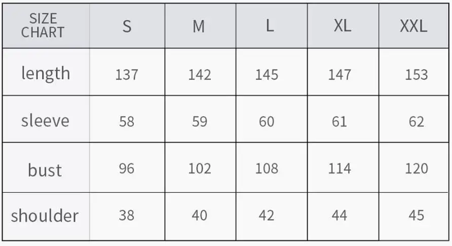 S: ширина плеч 38 см, обхват груди 96 см, длина рукава 58 см, длина 137 см M: плечо 40 см, обхват груди 102 см, рукав 59 см, длина 142 см L: ширина плеч 42 см, обхват груди 108 см, длина рукава 60 см, длина 145 см XL: Плечо 44 см, обхват груди 112 см, рукав 61 см, длина 147 см 2XL: Плечо 45 см, бюст 120 см, рукав 62 см, длина 153 см
