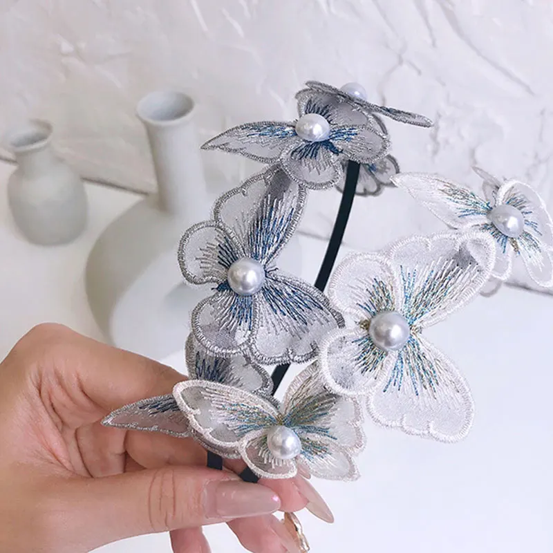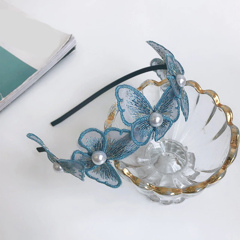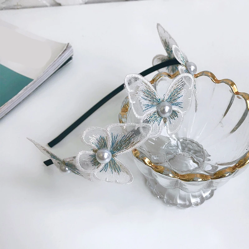 Повязка на голову с бабочкой, женские повязки на голову, кружевные сетчатые обручи с бабочками, головные уборы с жемчужинами, обручи на голову, аксессуары для волос в Корейском стиле