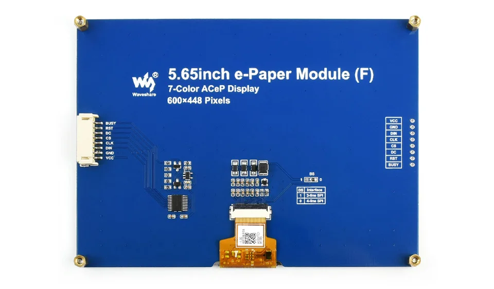 Пассивный отражающийОсобенности с первого взглядаПередовая технология Color ePaper (ACeP), поддерживает 7-цветный дисплейБез подсветки, долго отображает последнее содержимое даже при отключении питанияСверхнизкое энергопотребление, в основном мощность требуется только для освеженияИнтерфейс SPI для подключения к платам контроллера, таким как Raspberry Pi/Jetson Nano/Arduino/STM32 и т. д.Встроенный транслятор напряжения, совместим с 3,3 В/5 В MCUsПоставляется с разработчиками и руководством (примеры для Raspberry Pi/Jetson Nano/Arduino/STM32)ХарактеристикиРабочее напряжение3,3 В/5 ВЦвет дисплеяACeP 7 цветовИнтерфейс3-проводной SPI, 4-проводной SPIСерая шкала2Габаритные размеры138,5 × 100,5 ммВремя полного обновления<35sРазмер дисплея114,9 × 85,8 ммМощность обновления50 мВт (тип.)Шаг точки0,1915 × 0,1915 ммТок в режиме ожидания<0,01 мА (почти нет)Разрешение600 × 448 пикселейУгол обзора> 170 °
