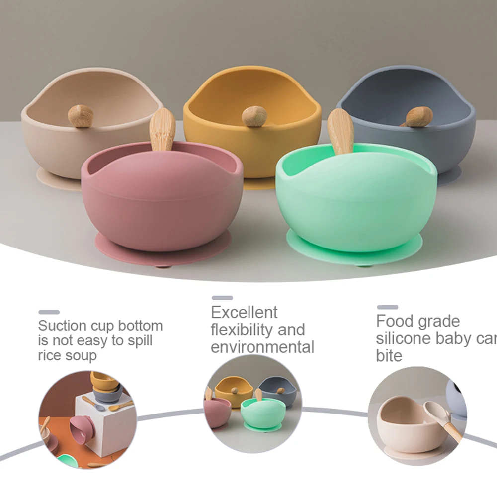 Baby Silicone Feeding Food Supplement Bowl Strong Sucker Waterproof Wooden Spoon Non-Slip Feeding Baby Plate Silicone Tableware