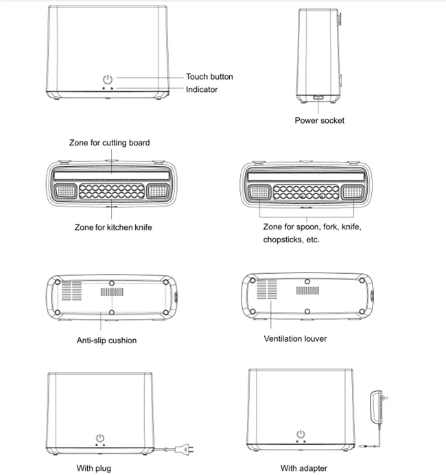 A. Это устройство может стерилизовать и сушить кухонные инструменты, такие как нож, разделочная доска и т. Д. B. Термопластичные и пищевые материалы. C. Ультрафиолетовое облучение и система горячего воздуха для стерилизации. D. Ультрафиолетовое облучение может убить обычные кухонные бактерии, такие как Escherichia coli, salmonella и т. д. Е. Система горячего воздуха может быстро высушить кухонные инструменты и поддерживать их санитарно. F. Время стерилизации составляет 50 минут, автоматическое завершение стерилизации. G. Без остаточной воды, система горячего воздуха может быстро высушить кухонные инструменты и остаточную воду.