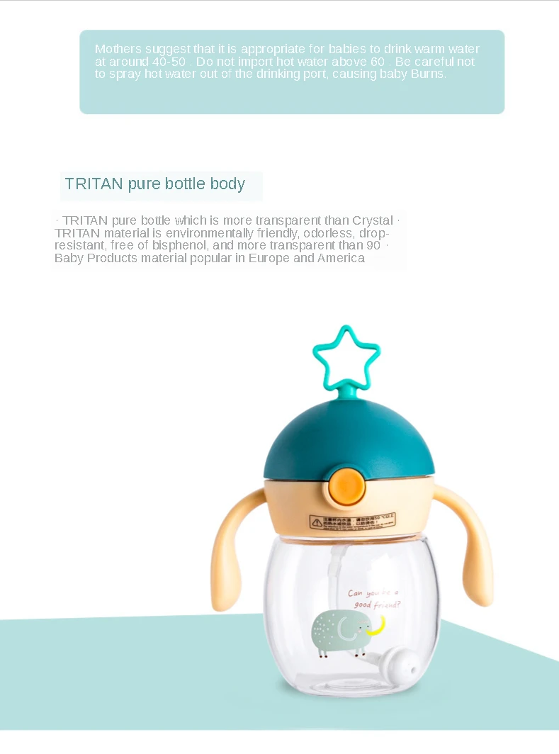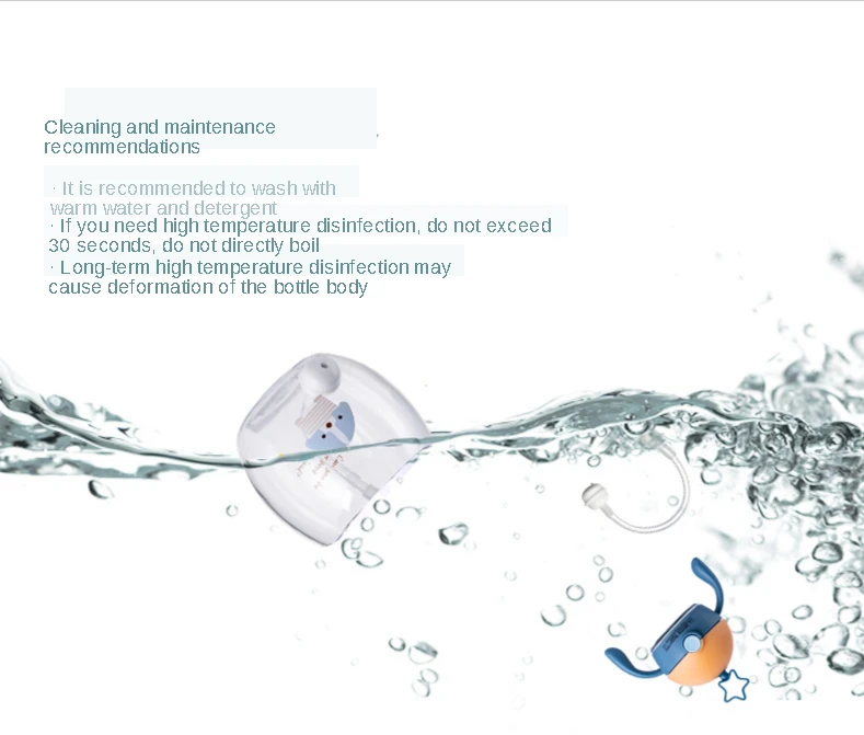 Before first use, please boil it in boiling water or fully disinfect the disinfection cabinet before use Please use 40-60 ℃ warm water to brew milk powder When using, please make sure that the bottle cap has been tightened to avoid milk leakage