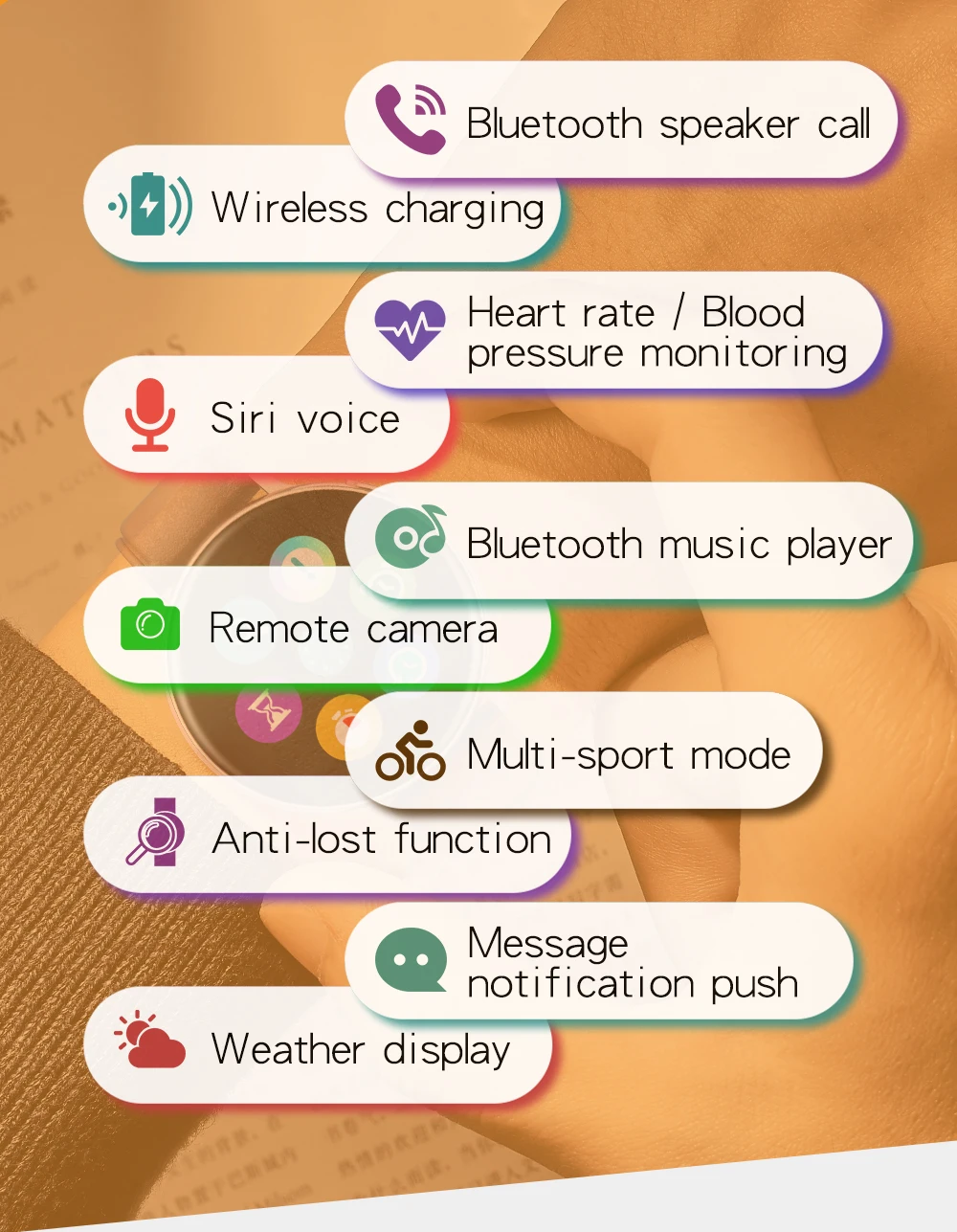 Календарь, калькулятор, защита от потери,Погода,Siri Voice,Беспроводная зарядка, Уведомления push, SMS оповещения push, мониторинг сна,