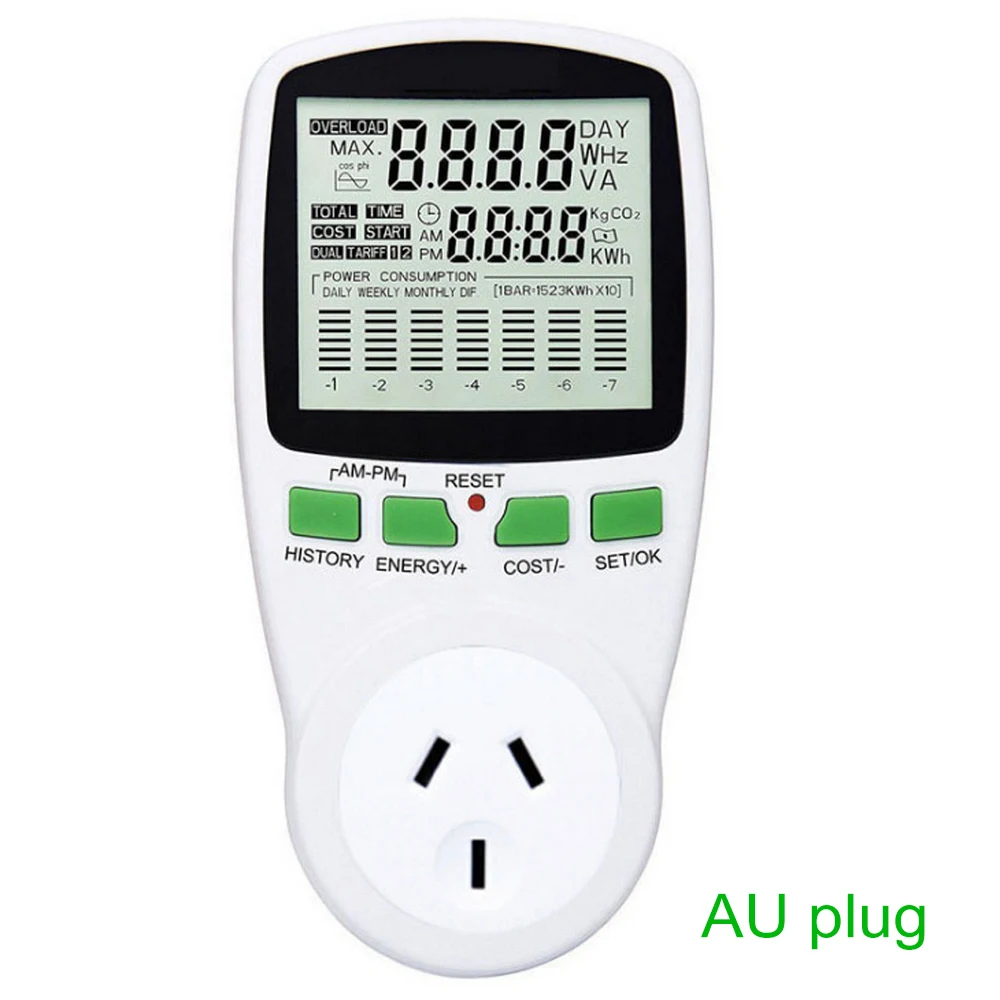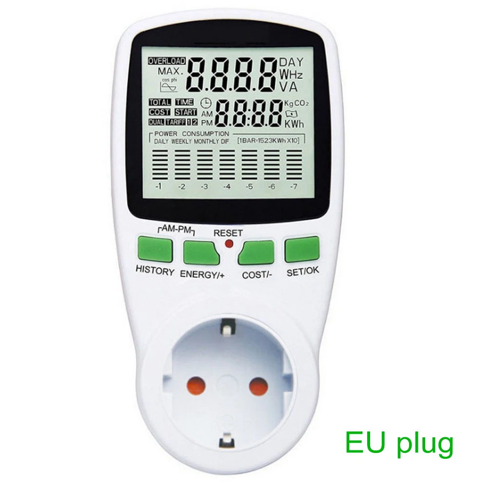 1. Потребляемая мощность монитора измерителя мощности: 0,5 Вт -Рабочее напряжение: 230В переменного тока 2, частотный дисплей: 50 Гц -Рабочий ток: Макс. 16А -Ширина Диапазон напряжения: 230V-250V -Установленная мощность дисплея (Ватты) составляет 0 Вт ~ 9999 Вт; Но фактическая мощность дисплея (Ватты) составляет 0 ~ 3680 Вт 3, диапазон Отображение времени: 0 секунд ~ 9999 дней -Диапазон отображения напряжения: 0V ~ 9999V -Текущий Дисплей (амперы): 0,000A ~ 16,000A 4, частотный дисплей: 0 Гц ~ 9999 Гц 5, Диапазон отображения цен: 0,00 стоимости/кВтч & iexcl; «99,99 стоимости/кВтч 6, отображение суммы кВт/ч и стоимости: 0,000квтч-9999квтч, 0,00 стоимость ---- 9999 стоимость 7,2-pin немецкая штепсельная вилка -Функция sanzeige