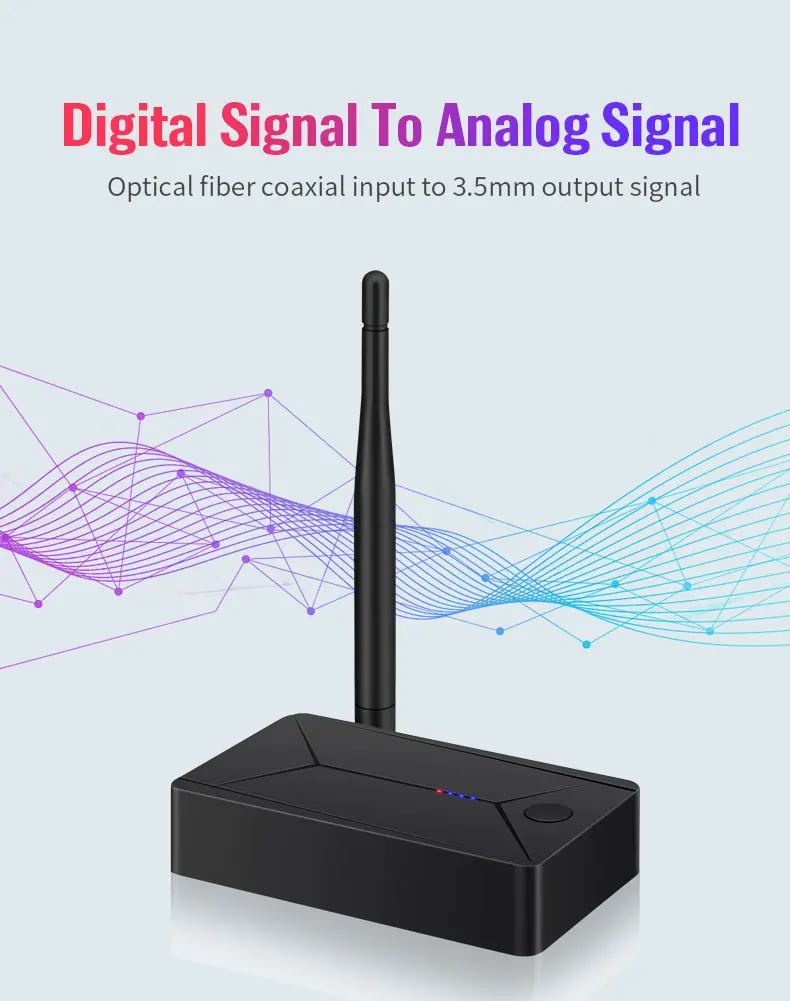 2: цифро-аналоговый сигнал, Подключите Телевизор панель волокнистой или коаксиальный кабель подключения продукта, 3,5 мм аудио кабель к динамику. Он может легко решает проблему остатка ТВ без 3,5 мм аудио порт без Bluetooth-колонки.