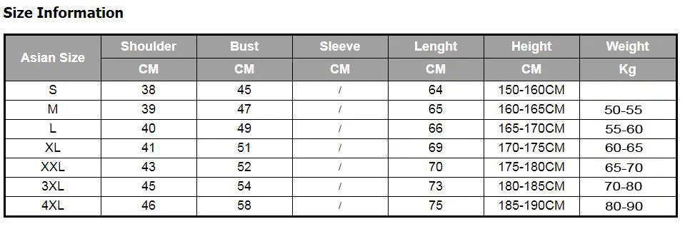 2: этот размерАзиатский размер, Он меньше на 2-3 размера, чем Европейский/американский размер, поэтому очень важно сравнить размер плеч и груди 3: Если вы не уверены в своем размере, сообщите нам или сообщите рост _ см и вес _ кг. Мы дадим предложение