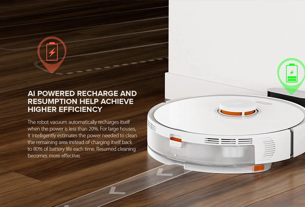 Робот будет автоматически заряжать обратно, когда мощность меньше 20%, и оценить необходимое время зарядки в соответствии с областью несметной области. Когда мощность будет достаточна, робот будет продолжать очищать несметную область.