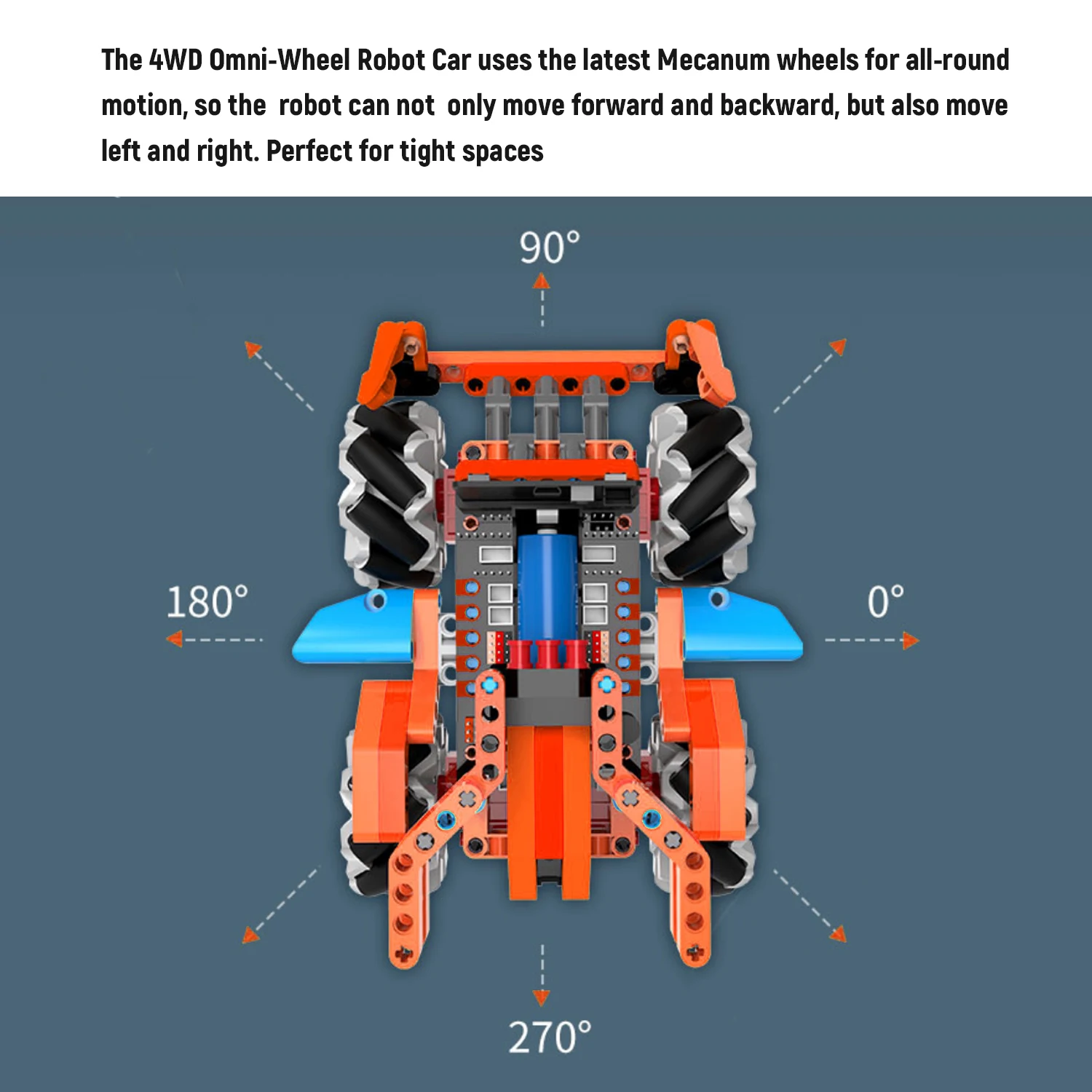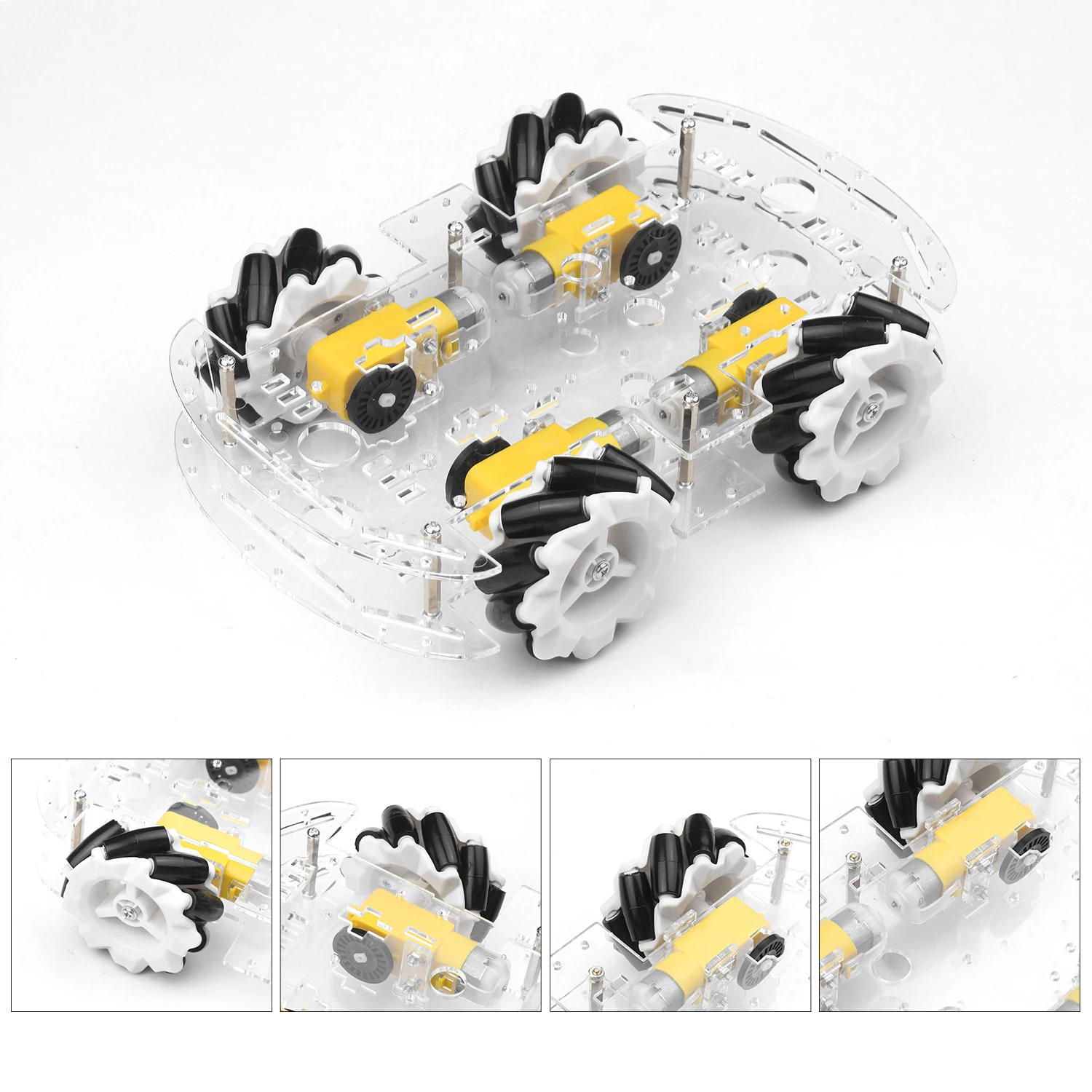 4 колеса Mecanum: 4 колеса Mecanum 65 мм могут быть перемещены в любом направлении без изменения направления вращения колес. Они изготовлены из прочного инженерного пластика и не легко повреждены.