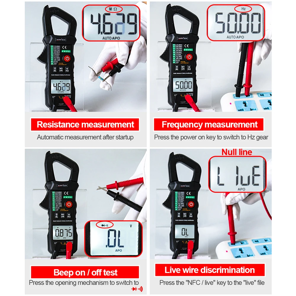 Функции: измерение напряжения переменного и постоянного тока, Измерение тока переменного и постоянного тока, Измерение частоты, измерение емкости, измерение сопротивления, испытание температуры, диод, звуковой сигнал ВКЛ-ВЫКЛ, NFC, линия нулевого огня, светильник вспышки, истинный RMS, сброс до нуля, Автоматический диапазон, звуковой сигнал и светильник, Удержание данных, задний светильник экрана, Автоматическое выключение.