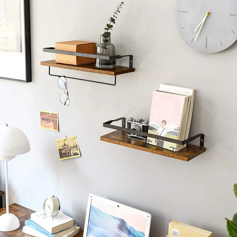 Высококачественные полки для хранения: плавающие полки изготовлены из высококачественной деревенской ДСП и металла. Легко чистить. Металлическая конструкция с защитными и полотеневыми рельсами, прочная, прочная грузоподъемность. Идеально подходит для спальни, гостиной, офиса.