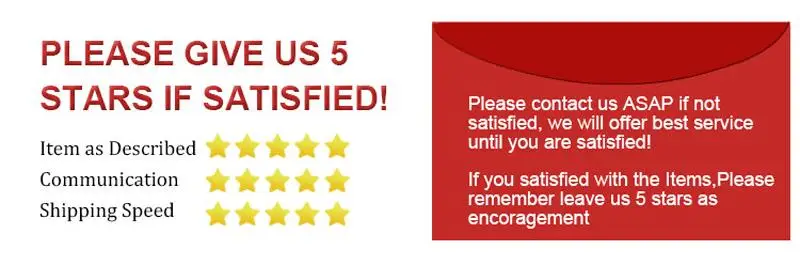 1. Пожалуйста, оставьте 5 звезд отзывы, если вы удовлетворены нашей продукцией и обслуживанием, Мы будем признательны (товар, как описано 5 звезд, связь 5 звезд, время доставки 5 звезд).