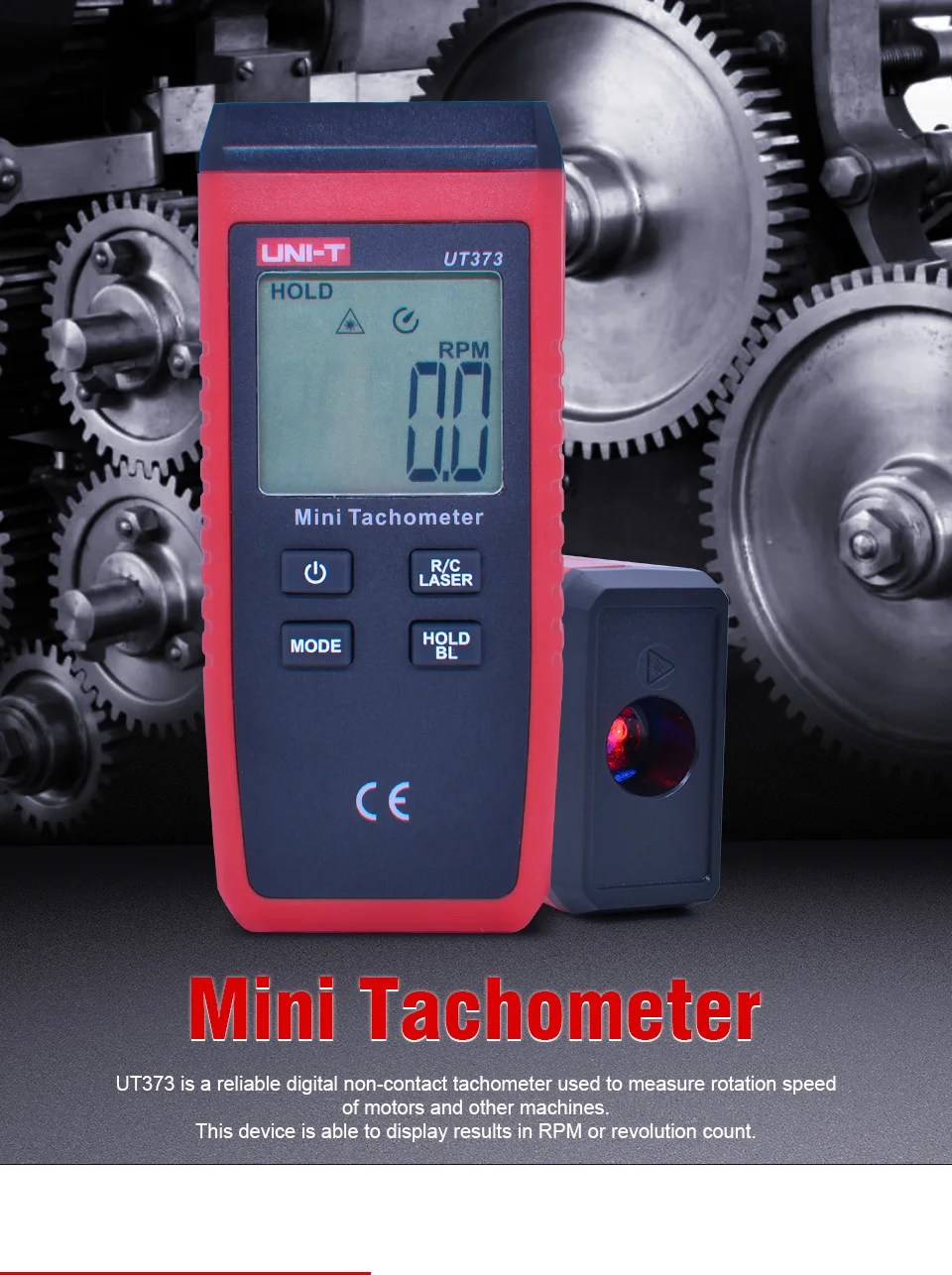 UT373 является надежным цифровым бесконтактным тахометром, используемым для измерения скорости вращения двигателей и других машин. Это устройство может отображать результаты в оборотах или оборотах. UT373 способен безопасно измерять вращающиеся объекты с помощью неинтрузивного метода.