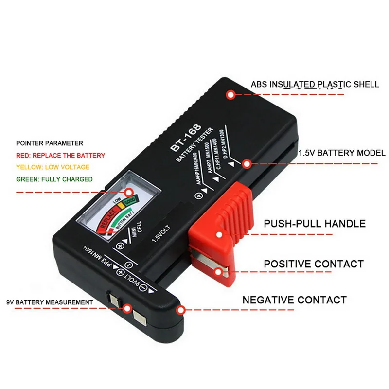 <Точные и Легко читаемые: аналоговый дисплей игла движется на цветовой коде, калиброванная шкала, чтобы быстро определить «хороший» (зеленый), «низкий» (желтый), И «заменить/перезарядить» (красный) состояние батареи.