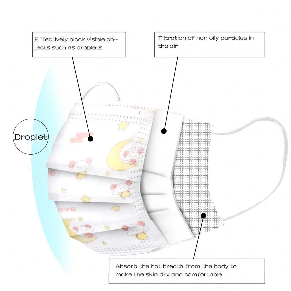 Характеристика: 1. Изготовлен из экологически чистых материалов, влагостойкий, нетоксичный, не раздражающий, мягкий и удобный. 2. Дышащие материалы и милые узоры делают его практичным и модным. 3. Специальный трехслойный нетканый дизайн обеспечивает защиту от пыли, выхлопных газов автомобиля и пыльцы. 4. Идеальный дизайн, когда вы носите его, он идеально подходит для вашего лица. Эластичные серьги легко носить и не надавливать на уши. 5. Маникюрный салон или любая другая область, которая может нуждаться в защите Посылка включает в себя: