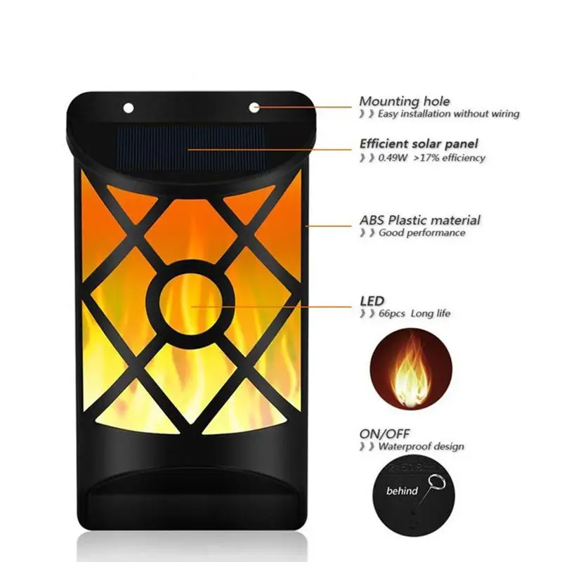 Мерцающие Настенные светильники с пламенем являются водонепроницаемыми и прочными и предназначены для использования на открытом воздухе. Встроенный литиево-ионный аккумулятор на солнечной батарее, источник питания не требуется.