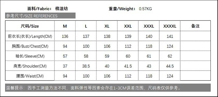 M: Длина 136 см, обхват груди 94 см, рукав 57 см, ширина плеч 37 см, обхват талии 94 см L: Длина 137 см, обхват груди 100 см, рукав 58 см, ширина плеч 38,5 см, обхват талии 100 см Размер XL: Длина 138 см, обхват груди 106 см, рукав 59 см, 40 см, обхват талии 106 см 2XL: Длина 139 см, обхват груди 112 см, рукав 60 см, плечо 41,5 см, обхват талии 112 см 3XL: Длина 140 см, обхват груди 118 см, рукав 61 см, Shoulder43cm, обхват талии 118 см 4XL: Длина 141 см, обхват груди 124 см, длина рукава 62 см, плечо 44,5 см, обхват талии 124 см