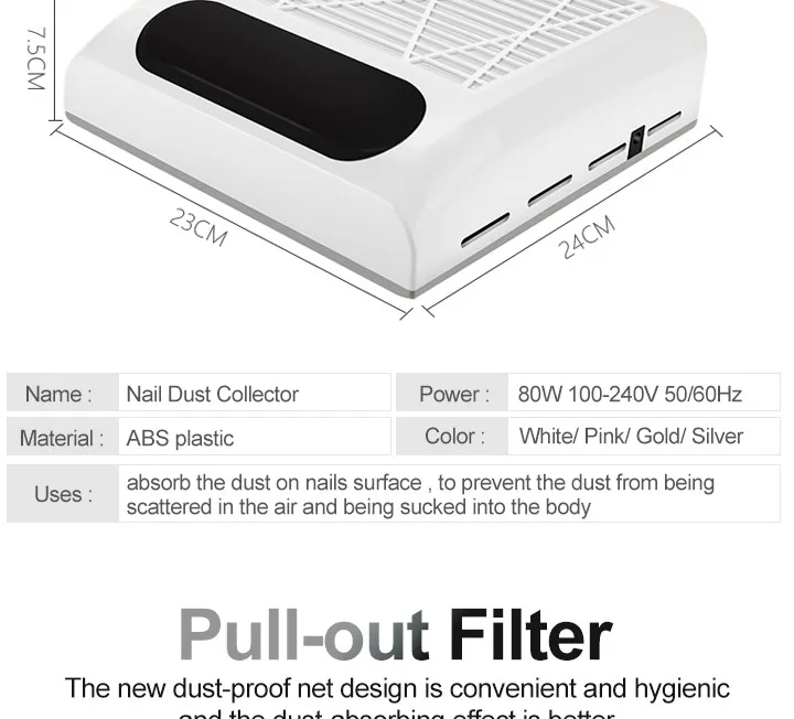 1. Высокая мощность с сильной вакуумной способностью. 2. Всасывание поверхности пыли для ногтей, чтобы предотвратить попадание пыли в воздух. 3. Посылка включает в себя 1 пылесборник для легкой очистки и замены 4. Подходит для маникюрного салона, школы дизайна ногтей/колледжа, личного использования и т. д. 5. Многоразовый фильтр, используйте фен для волос, чтобы выдуть его, но не мойте его. 6. Высокое качество, прочный, привлекательный и простой в эксплуатации. 7. Большая площадь, достаточно большая для 2 рук.