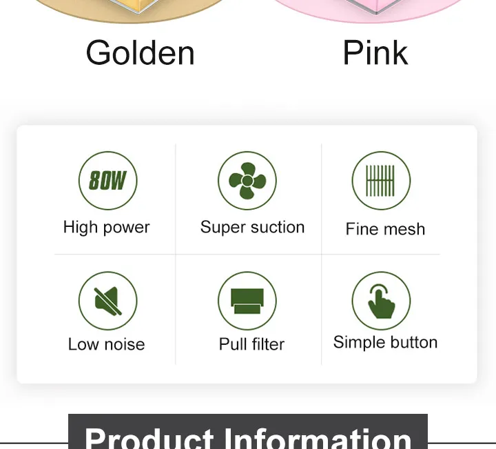 Тип изделия: всасывание пыли для ногтей Цвет: белый/серебристый/розовый/золотой Материал: АБС-пластик Мощность: 80 Вт Мощный пылеуловитель для ногтей Функция: профессиональная электрическая вакуумная машина для ногтей Посылка: 1 пылеуловитель для ногтей Штепсельная вилка ЕС/штепсельная вилка США 1 пылезащитный пакет 1 Руководство пользователя 1 оригинальная коробка