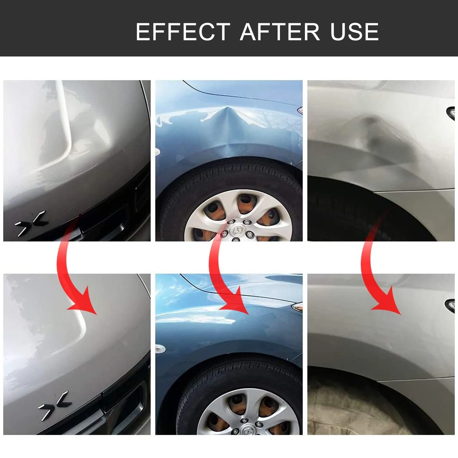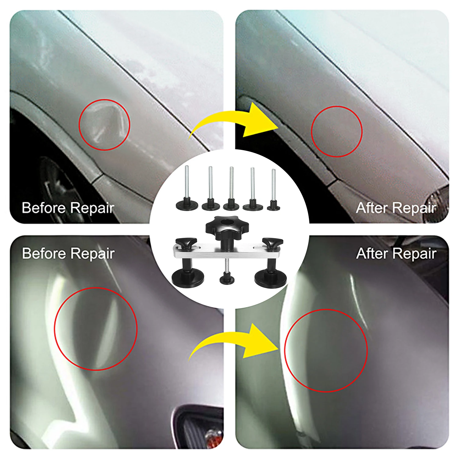 Прочные многофункциональные ремонтные комплекты--- Стабильная конструкция из прочной нержавеющей стали, прочная и долговечная. Набор для удаления вмятин является эффективным инструментом для ремонта вмятин, который может быть использован для ремонта большинства типов автомобильных брезентовых складок, вызванных поворотом, поворотом, царапинами, он также может ремонтировать вмятины на холодильниках, мотоциклетные тела, стиральные машины и т. Д.